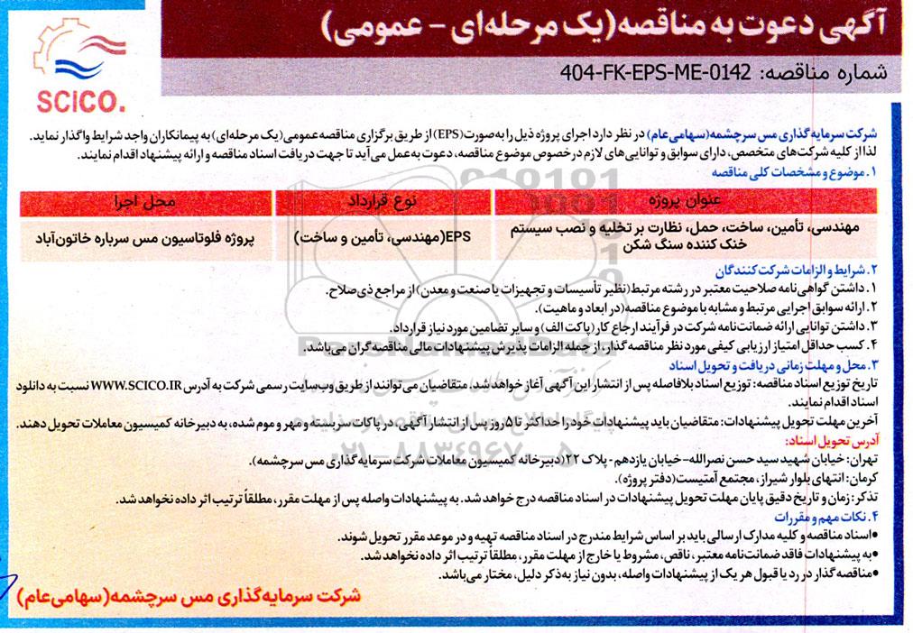 شرکت سرمایه گذاری مس سرچشمه (سهامی عام) در نظر دارد اجرای پروژه ذیل را به صورت (EPS) از طریق برگزاری مناقصه عمومی یک مرحله ای به پیمانکاران واجد شرایط واگذار نماید. لذا از کلیه شرکت های متخصص، دارای سوابق و توانایی های لازم در خصوص موضوع مناقصه، دعوت به عمل می آید تا جهت دریافت اسناد مناقصه و ارائه پیشنهاد اقدام نمایند.