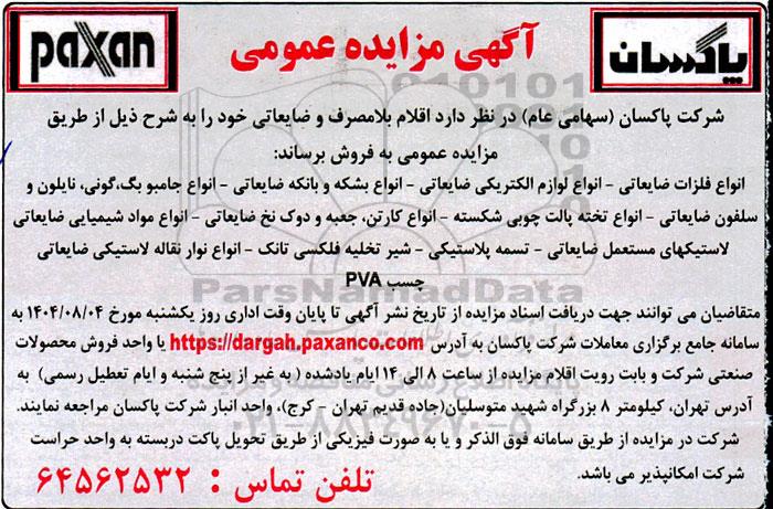 شرکت پاکسان (سهامی عام) در نظر دارد اقلام بلا مصرف و ضایعاتی خود را به شرح ذیل از طریق مزایده عمومی به فروش برساند