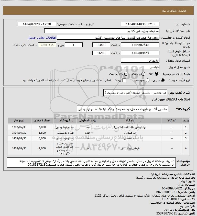 تلفن:5- 88349670 (021) فکس: 88349673 (021) Website: www.ParsNamadData.com E-mail: Info@ParsNamadData.com استعلام آب معدنی - دلستر -آبمیوه (طبق شرح پیوست )