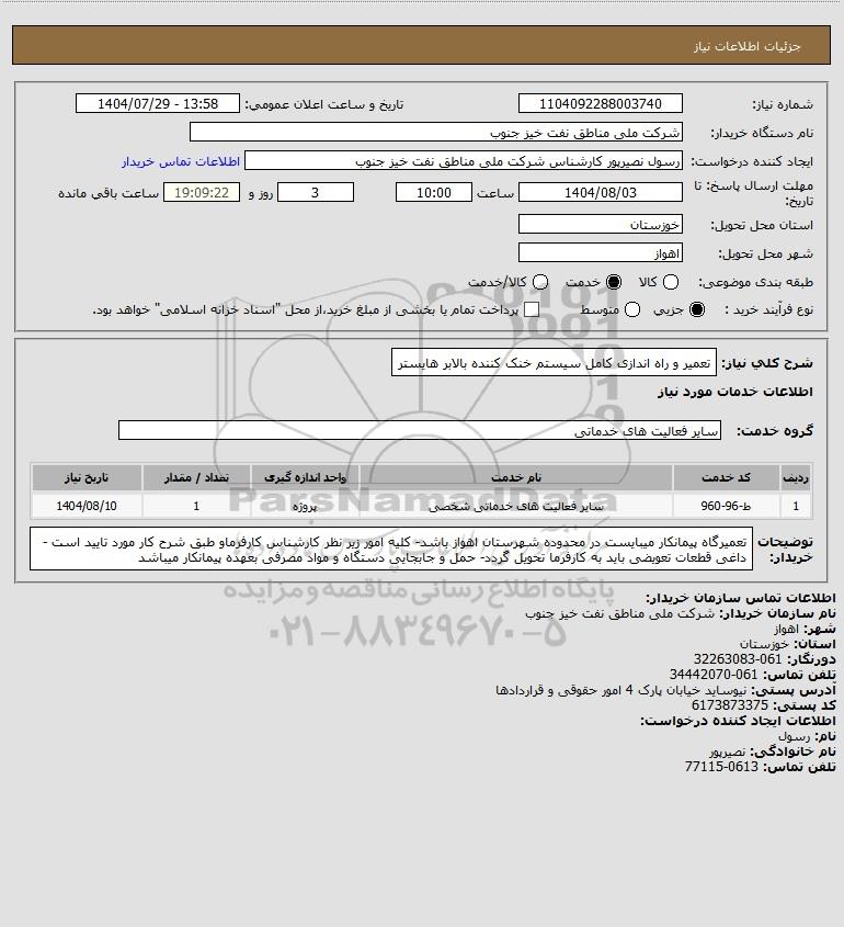 تلفن:5- 88349670 (021) فکس: 88349673 (021) Website: www.ParsNamadData.com E-mail: Info@ParsNamadData.com استعلام تعمیر و راه اندازی کامل سیستم خنک کننده بالابر هایستر