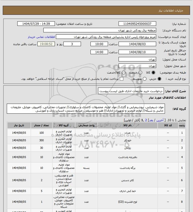 تلفن:5- 88349670 (021) فکس: 88349673 (021) Website: www.ParsNamadData.com E-mail: Info@ParsNamadData.com استعلام درخواست خرید ملزومات اداری طبق لیست پیوست