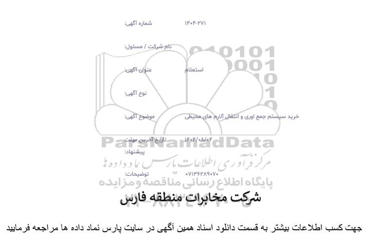 عنوان آگهی: استعلام خرید سیستم جمع آوری و انتقال آلارم های محیطی