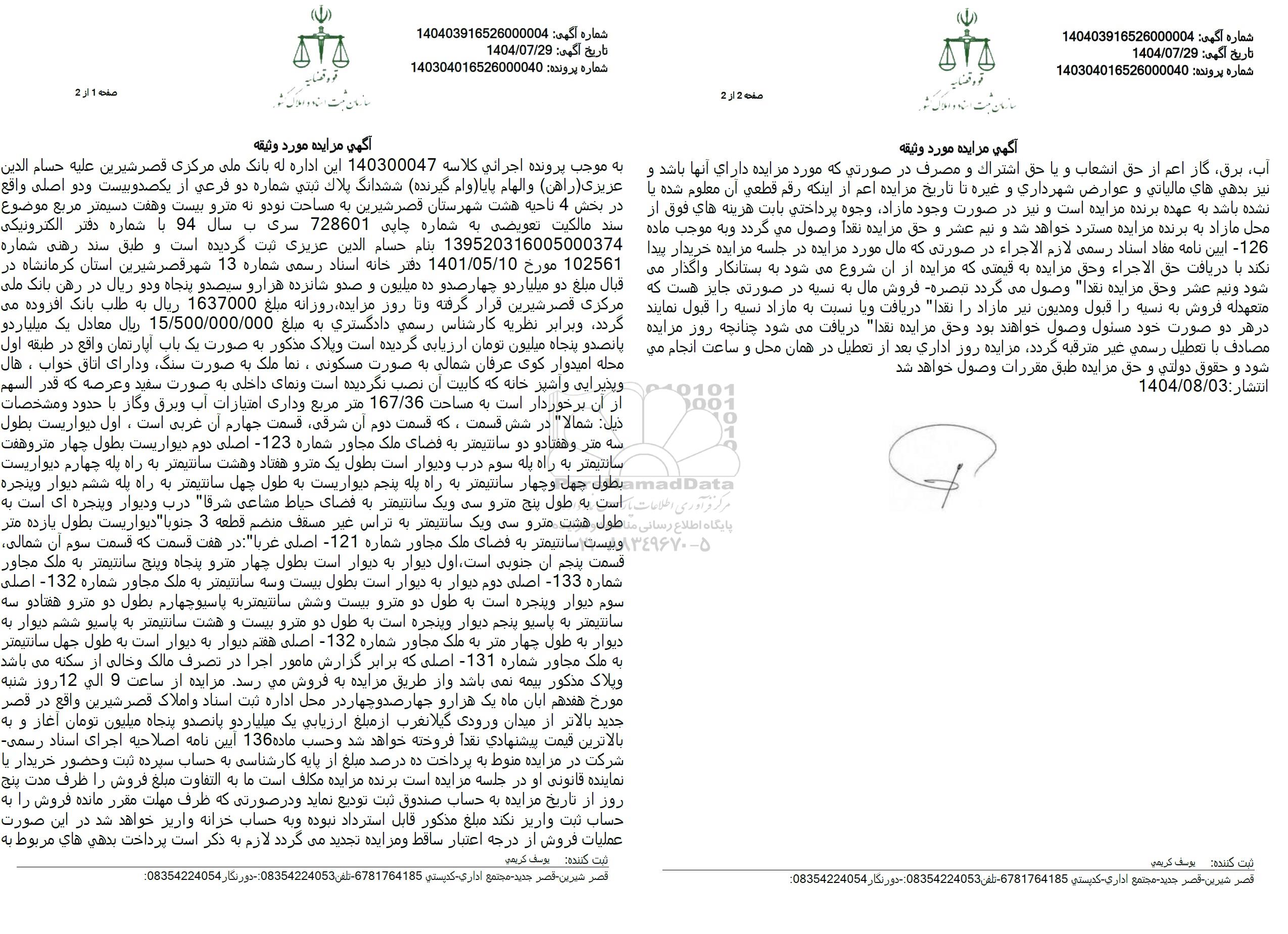 | عنوان آگهی: مزایده ششدانگ پلاک ثبتی شماره دو فرعی از یکصدو بیست و دو اصلی |
