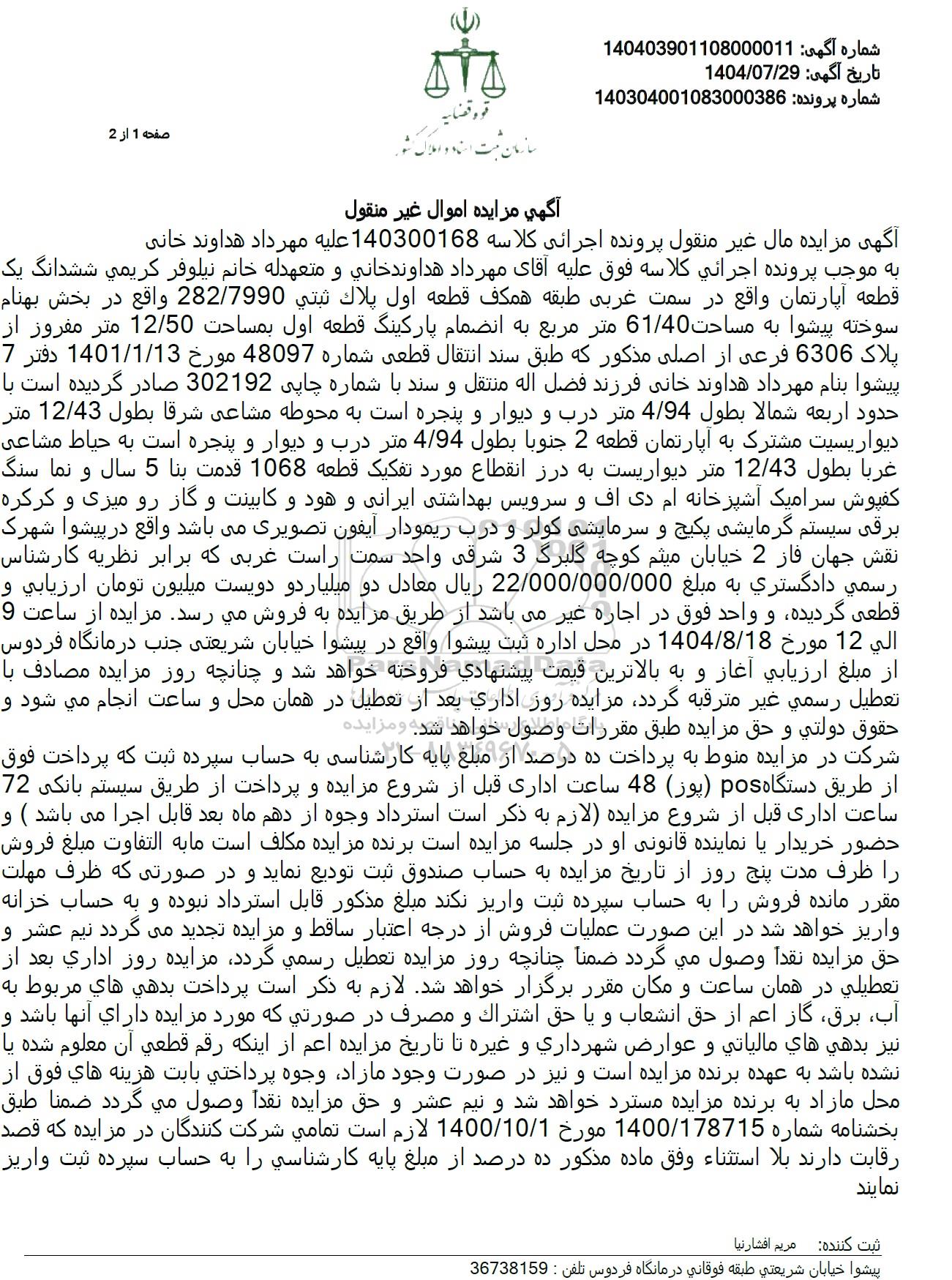 آگهی مزایده مال غیر منقول پرونده اجرائی کلاسه 140300168 علیه مهرداد هداوند خانی