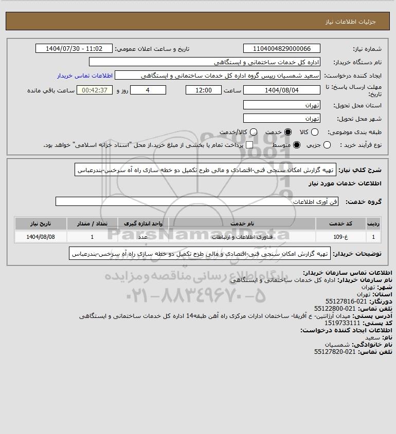 تلفن:5- 88349670 (021) فکس: 88349673 (021) Website: www.ParsNamadData.com E-mail: Info@ParsNamadData.com استعلام تهیه گزارش امکان سنجی فنی-اقتصادی و مالی طرح تکمیل دو خطه سازی راه آه سرخس-بندرعباس