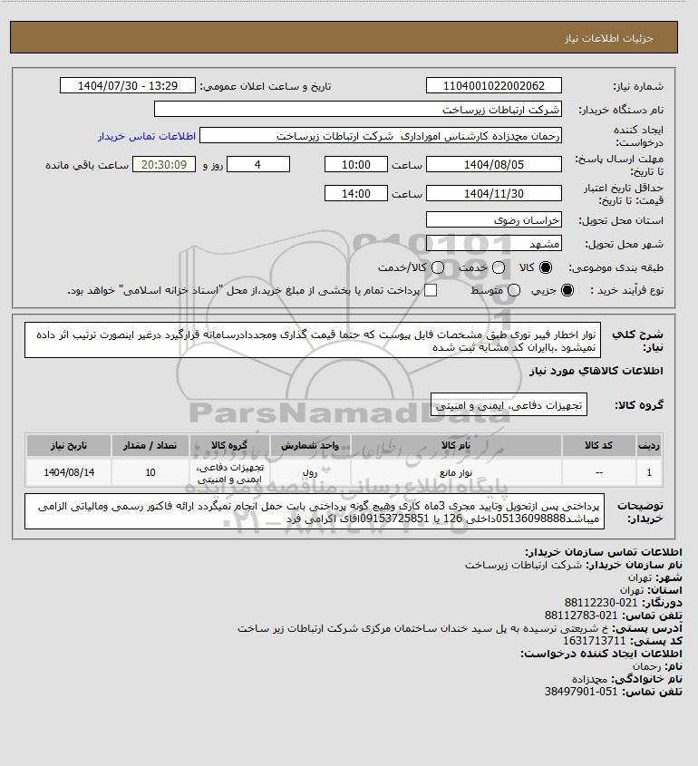 تلفن:5- 88349670 (021) فکس: 88349673 (021) Website: www.ParsNamadData.com E-mail: Info@ParsNamadData.com استعلام نوار اخطار فیبر نوری طبق مشخصات فایل پیوست که حتما قیمت گذاری ومجددادرسامانه قرارگیرد درغیر اینصورت ترتیب اثر داده نمیشود .باایران کد مشابه ثبت شده