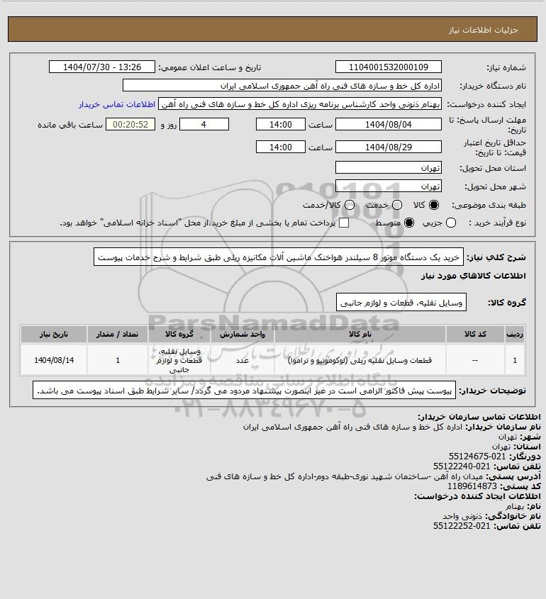 تلفن:5- 88349670 (021) فکس: 88349673 (021) Website: www.ParsNamadData.com E-mail: Info@ParsNamadData.com استعلام خرید یک دستگاه موتور 8 سیلندر هواخنک ماشین آلات مکانیزه ریلی طبق شرایط و شرح خدمات پیوست