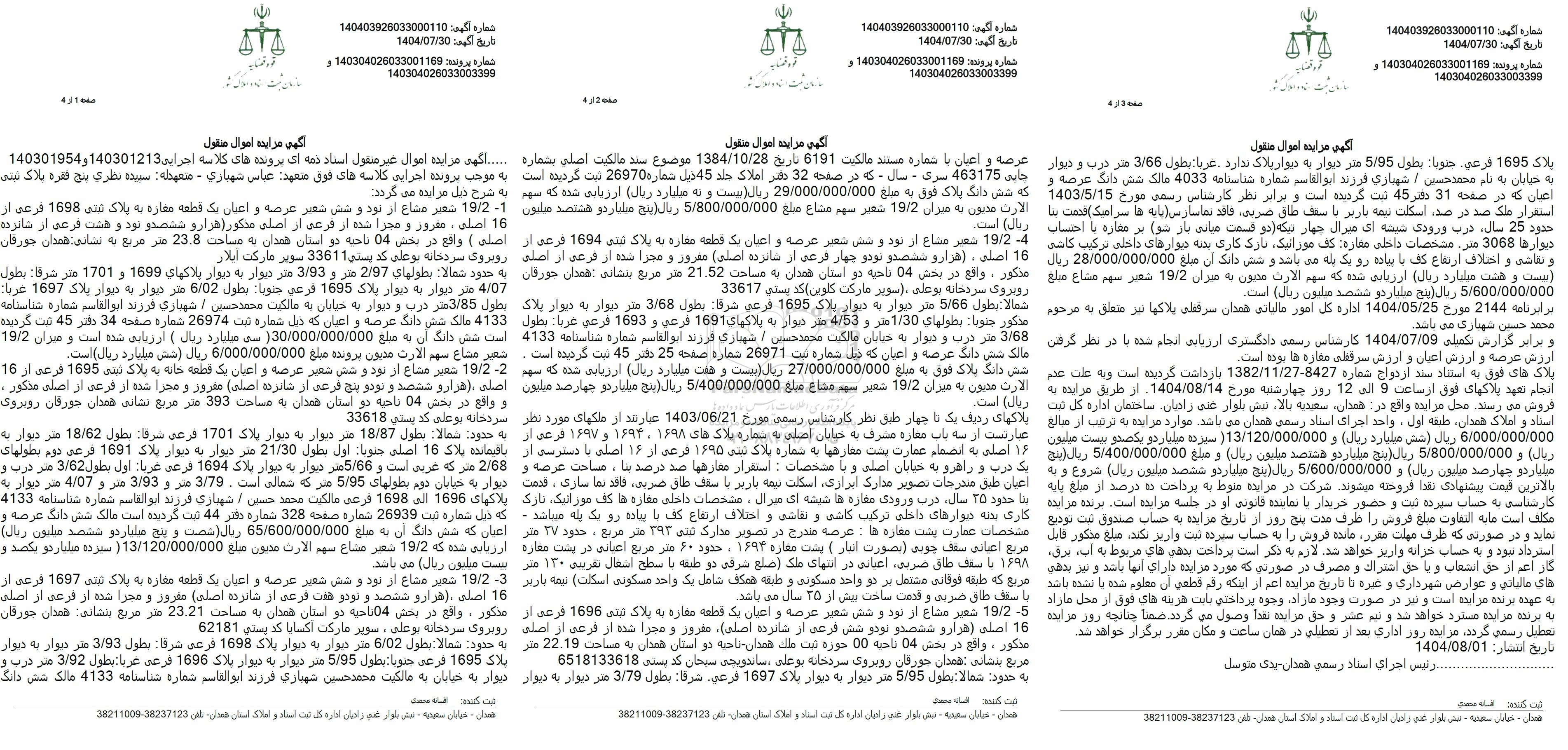 آگهی مزایده اموال غیر منقول اسناد ذمه ای پرونده های کلاسه اجرایی 140301213 و 140301954 به موجب پرونده اجرایی کلاسه های فوق متعهد عباس شهبازی - متعهدله سپیده نظري پنج فقره پلاک ثبتی به شرح ذیل مزایده می گردد