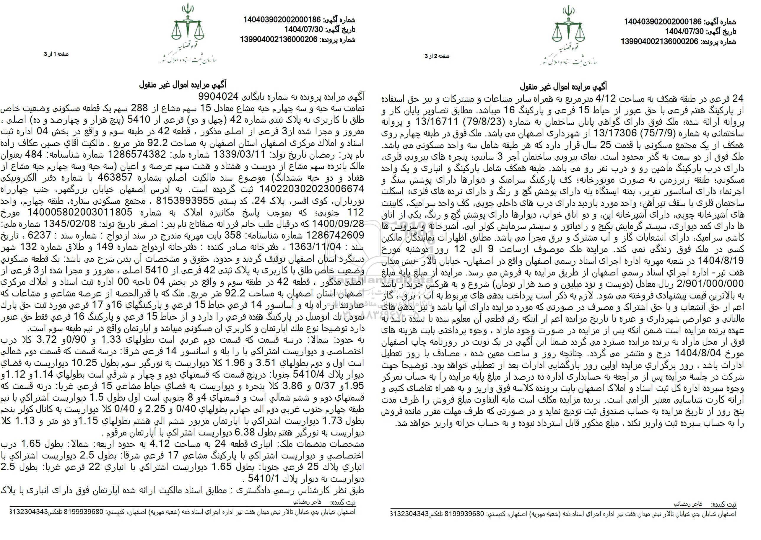 تلفن:5- 88349670 (021) فکس: 88349673 (021) Website: www.ParsNamadData.com E-mail: Info@ParsNamadData.com مزایده تمامت سه حبه و سه چهارم حبه مشاع معادل 15 سهم مشاع از 288 سهم یک قطعه مسکونی به پلاک ثبتی شماره 42 فرعی از 5410 اصلی