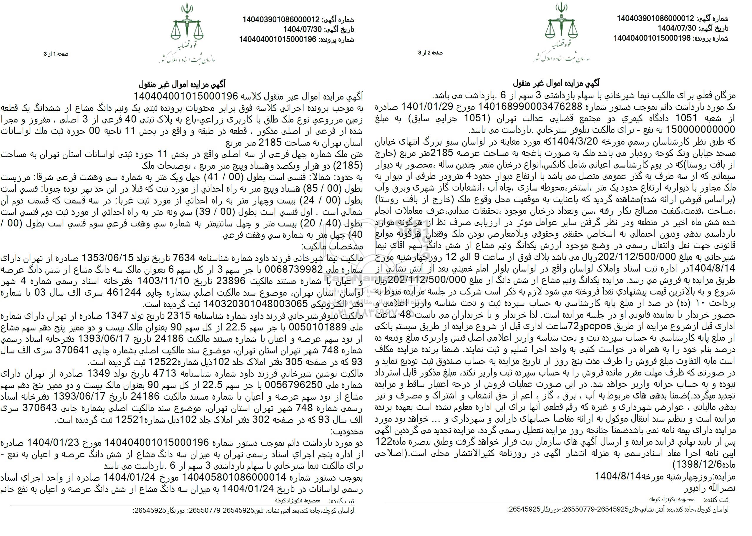 مسجد خیابان ونک کوچه رودبار میباشد ملک به صورت باغچه به مساحت عرصه 2185 متر مربع خارج از بافت روستا که در یوم کارشناسی اعیانی شامل کانکس انواع درختان مثمر چندین ساله محصور به دیوار ( سیمانی که از سه طرف به گذر عمومی متصل میباشد با ارتفاع دیوار حدود 4 متر و در طرفی از دیوار به ملک مجاور با دیوار به ارتفاع حدود یک متر استخر ، محوطه سازی چاه آب انشعابات گاز شهری و برق و اب بر اساس قبوض ارائه شده مشاهده گردید که با عنایت به موقعیت محل وقوع ملک خارج از بافت روستا) مساحت قدمت کیفیت مصالح بکار رفته سن و تعداد درختان موجود تحقیقات میدانی عرف معاملات انجام شده شش ماه اخیر در منطقه و در نظر گرفتن سایر عوامل موثر در ارزیابی صرف نظر از هرگونه موارد بازداشتی بدهی و دیون احتمالی به اشخاص حقیقی و حقوقی و بلا معارض بودن ملک و فقدان هرگونه موانع قانونی جهت نقل و انتقال رسمی در وضع موجود ارزش یکدانگ و نیم مشاع از شش دانگ سهم آقای نیما مشخصات مالکیت شیرخانی به مبلغ 202.112.500.000 ریال می باشد بلاك فوق از ساعت 9 الی 12 روز چهارشنبه مورخ 1404.8.14 در اداره ثبت اسناد و املاک لواسان واقع در لواسان بلوار امام خمینی بعد از اتش نشانی از طریق مزایده به فروش می رسد. مزایده یکدانگ و نیم مشاع از شش دانگ از مبلغ 202.112.500.000 ریال شروع و به بالاترین قیمت پیشنهادی نقدا فروخته میشود لازم به ذکر است شرکت در جلسه مزایده منوط به پرداخت 10 (ده) در صد از مبلغ پایه کارشناسی به حساب سپرده ثبت و تحت شناسه واریز اعلامی و حضور خریدار با نماینده قانونی او در جلسه مزایده است. لذا خریدار و یا خریداران می بایست 48 ساعت اداری قبل از شروع مزایده از طریق pcpos و 72 ساعت اداری قبل از شروع مزایده از طریق سیستم بانکی از مبلغ پایه کارشناسی به حساب سپرده ثبت و تحت شناسه واریز اعلامی اصل فیش واریزی مبلغ ودیعه ده درصد بنام خود را به همراه درخواست کتبی به واحد اجرا تسلیم و ثبت نمایند. ضمنا برنده مزایده مکلف است ما به التفاوت مبلغ فروش را ظرف مدت پنج روز از تاریخ مزایده به حساب صندوق ثبت تودیع نماید و در صورتی که ظرف مهلت مقرر مانده فروش را به حساب سپرده ثبت واریز نکند مبلغ مذکور قابل استرداد نبوده و به حساب خزانه واریز خواهد شد. در این صورت عملیات فروش از درجه اعتبار ساقط و مزایده تجدید میگردد. ضمنا بدهی های مربوط به آب ، برق ، گار، اعم از حق انشعاب و اشتراک و مصرف و نیز بدهی مالیاتی، عوارض شهرداری و غیره که رقم قطعی آنها برای این اداره معلوم نشده است بعهده برنده مزایده است و تنظیم سند انتقال موکول به ارائه مقاضا حسابهای دارایی و شهرداری و .... خواهد بود مورد مزایده دارای بیمه نامه نمی باشد ضمنا چنانچه روز مزایده تعطیل رسمی گردد مزایده تجدید میگرددین آگهی محدودیت پس از تایید نهایی فرایند مزایده و ارسال آگهی های سازمان ثبت قرار خواهد گرفت وطبق تبصره ماده 122 ایین نامه اجرا مفاد اسنادرسمی به منزله انتشار آگهی در روزنامه کثیر الانتشار محلی است.