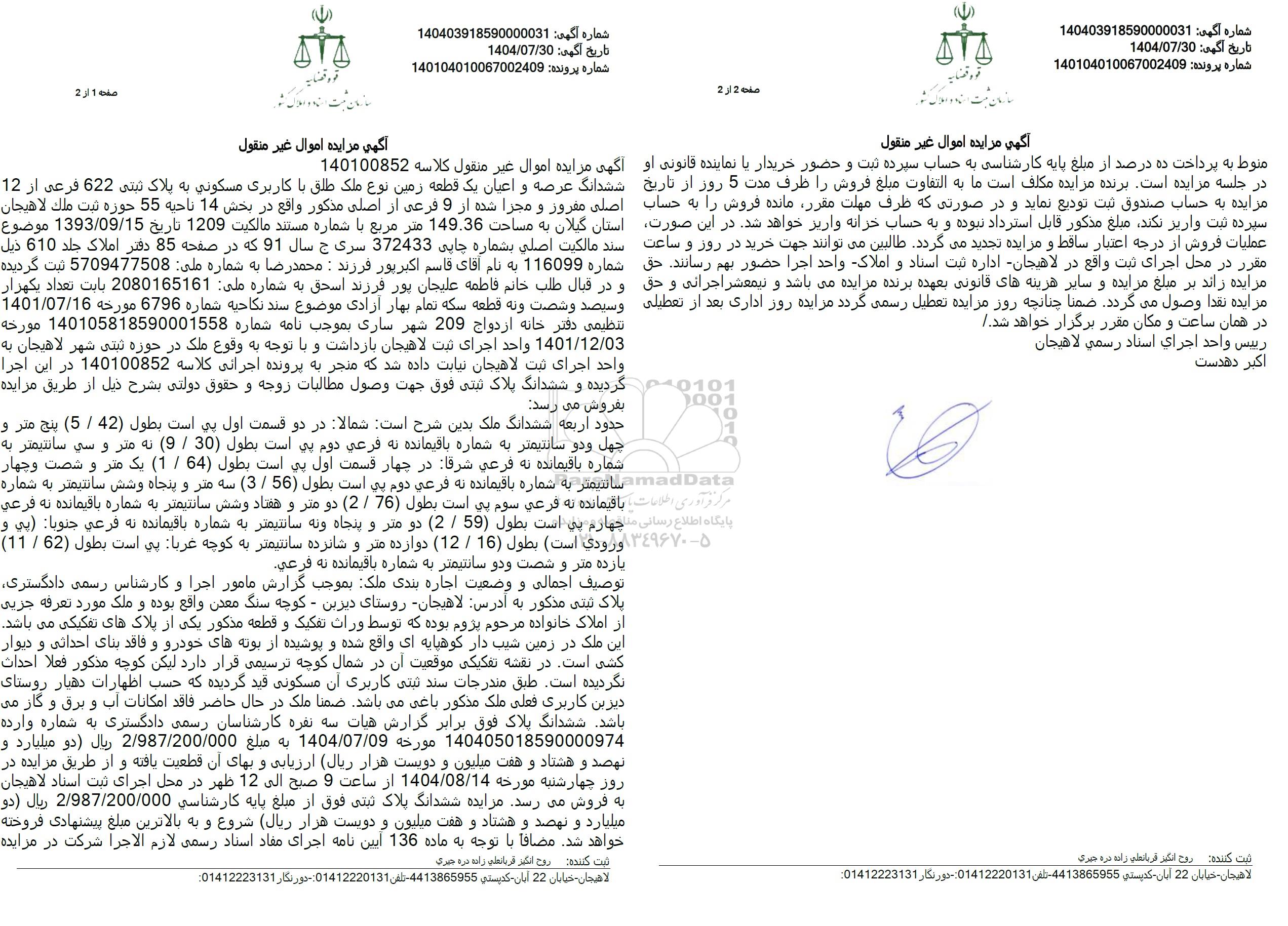 آگهی گزار اجرای ثبت اسناد لاهیجان