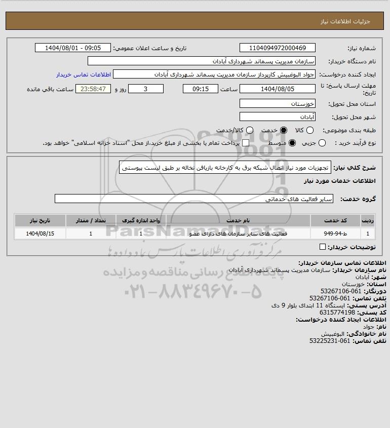تلفن:5- 88349670 (021) فکس: 88349673 (021) Website: www.ParsNamadData.com E-mail: Info@ParsNamadData.com استعلام تجهزیات مورد نیاز اتصال شبکه برق به کارخانه بازیافن نخاله بر طبق لیست پیوستی