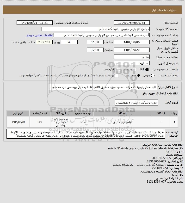 تلفن:5- 88349670 (021) فکس: 88349673 (021) Website: www.ParsNamadData.com E-mail: Info@ParsNamadData.com استعلام البسه فرم نیروهای حراست-جهت روئیت دقیق اقلام تقاضا به فایل پیوستی مراجعه شود.