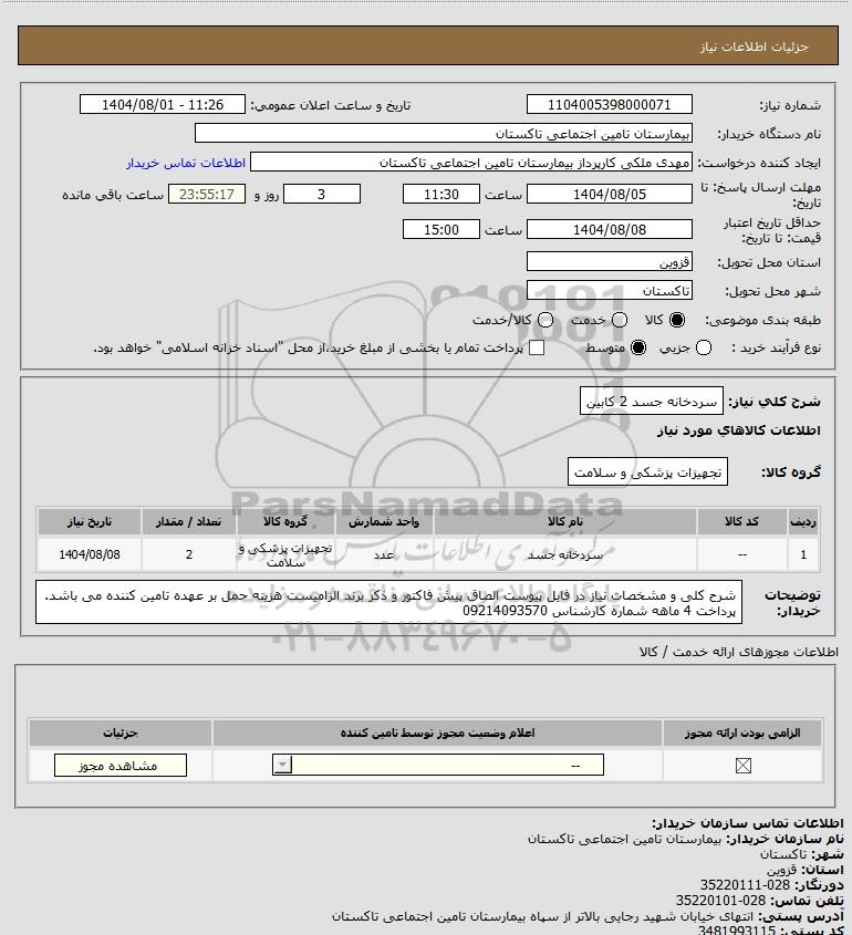تلفن:5- 88349670 (021) فکس: 88349673 (021) Website: www.ParsNamadData.com E-mail: Info@ParsNamadData.com استعلام سردخانه جسد 2 کابین