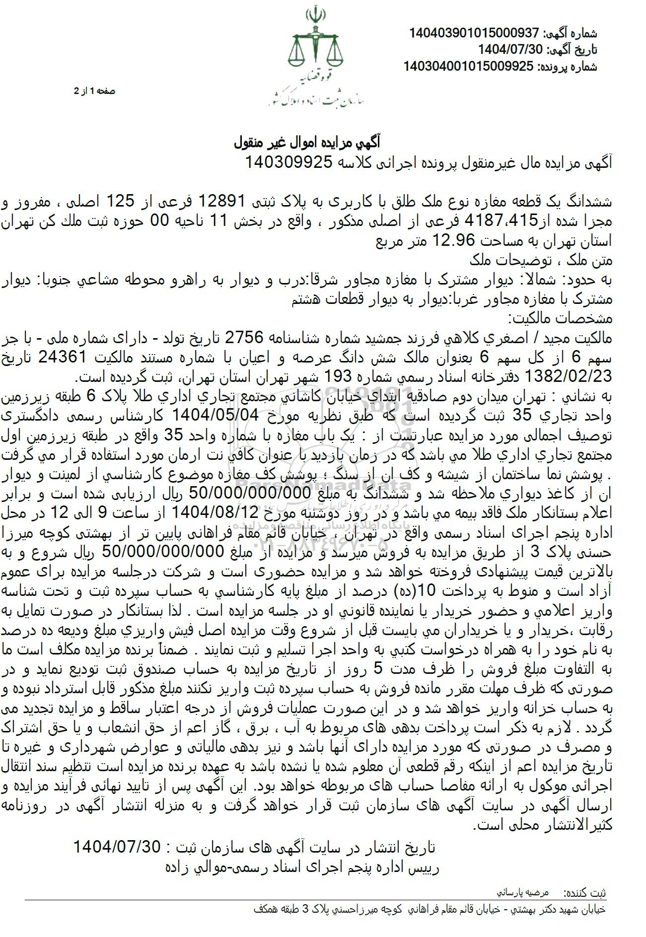 به نشانی : تهران میدان دوم صادقیه ابتداي خيابان كاشاني مجتمع تجاری اداری طلا پلاک 6 طبقه زیرزمین واحد تجاري 35 ثبت گردیده است که طبق نظریه مورخ 1404.05.04 کارشناس رسمی دادگستری توصیف اجمالی مورد مزایده عبارتست از: یک باب مغازه با شماره واحد 35 واقع در طبقه زیرزمین اول مجتمع تجاري اداري طلا می باشد که در زمان بازدید با عنوان کافي نت ارمان مورد استفاده قرار می گرفت پوشش نما ساختمان از شیشه و کف آن از سنگ ؛ پوشش کف مغازه موضوع کارشناسی از لمینت و دیوار آن از کاغذ ديواري ملاحظه شد و ششدانگ به مبلغ 50.000.000.000 ریال ارزیابی شده است و برابر اعلام بستانکار ملک فاقد بیمه می باشد و در روز دوشنبه مورخ 1404.08.12 از ساعت 9 الی 12 در محل اداره پنجم اجرای اسناد رسمی واقع در تهران، خیابان قائم مقام فراهانی پایین تر از بهشتی کوچه میرزا حسنی پلاک 3 از طریق مزایده به فروش میرسد و مزایده از مبلغ 50.000.000.000 ریال شروع و به بالاترین قیمت پیشنهادی فروخته خواهد شد و مزایده حضوری است و شرکت در جلسه مزایده برای عموم آزاد است و منوط به پرداخت (10 ده درصد از مبلغ پایه کارشناسی به حساب سپرده ثبت و تحت شناسه واریز اعلامی و حضور خریدار یا نماینده قانونی او در جلسه مزایده است. لذا بستانکار در صورت تمایل به رقابت ، خریدار و یا خریداران می بایست قبل از شروع وقت مزایده اصل فیش واريزي مبلغ ودیعه ده درصد به نام خود را به همراه درخواست کتبی به واحد اجرا تسلیم و ثبت نمایند. ضمناً برنده مزایده مکلف است ما به التفاوت مبلغ فروش را ظرف مدت 5 روز از تاریخ مزایده به حساب صندوق ثبت تودیع نماید و در صورتی که ظرف مهلت مقرر مانده فروش به حساب سپرده ثبت واریز نکنند مبلغ مذکور قابل استرداد نبوده و به حساب خزانه واریز خواهد شد و در این صورت عملیات فروش از درجه اعتبار ساقط و مزایده تجدید می گردد . لازم به ذکر است پرداخت بدهیهای مربوط به آب ، برق ، گاز اعم از حق انشعاب و یا حق اشتراک و مصرف در صورتی که مورد مزایده دارای آنها باشد و نیز بدهی مالیاتی و عوارض شهرداری و غیره تا تاریخ مزایده اعم از اینکه رقم قطعی آن معلوم شده یا نشده باشد به عهده برنده مزایده است تنظیم سند انتقال اجرانی موکول به ارائه مفاصا حسابهای مربوطه خواهد بود این آگهی پس از تایید نهایی فرآیند مزایده و ارسال آگهی در سایت آگهی های سازمان ثبت قرار خواهد گرفت و به منزله انتشار آگهی در روزنامه كثير الانتشار محلی است.