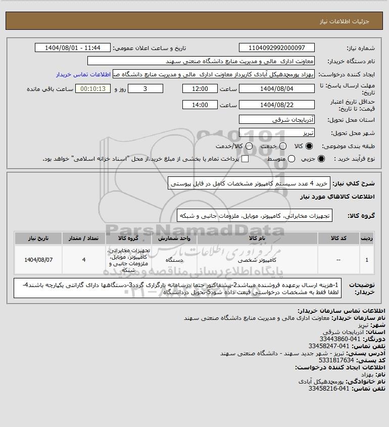 شرح کلی نیاز: خرید 4 عدد سیستم کامپیوتر مشخصات کامل در فایل پیوستی