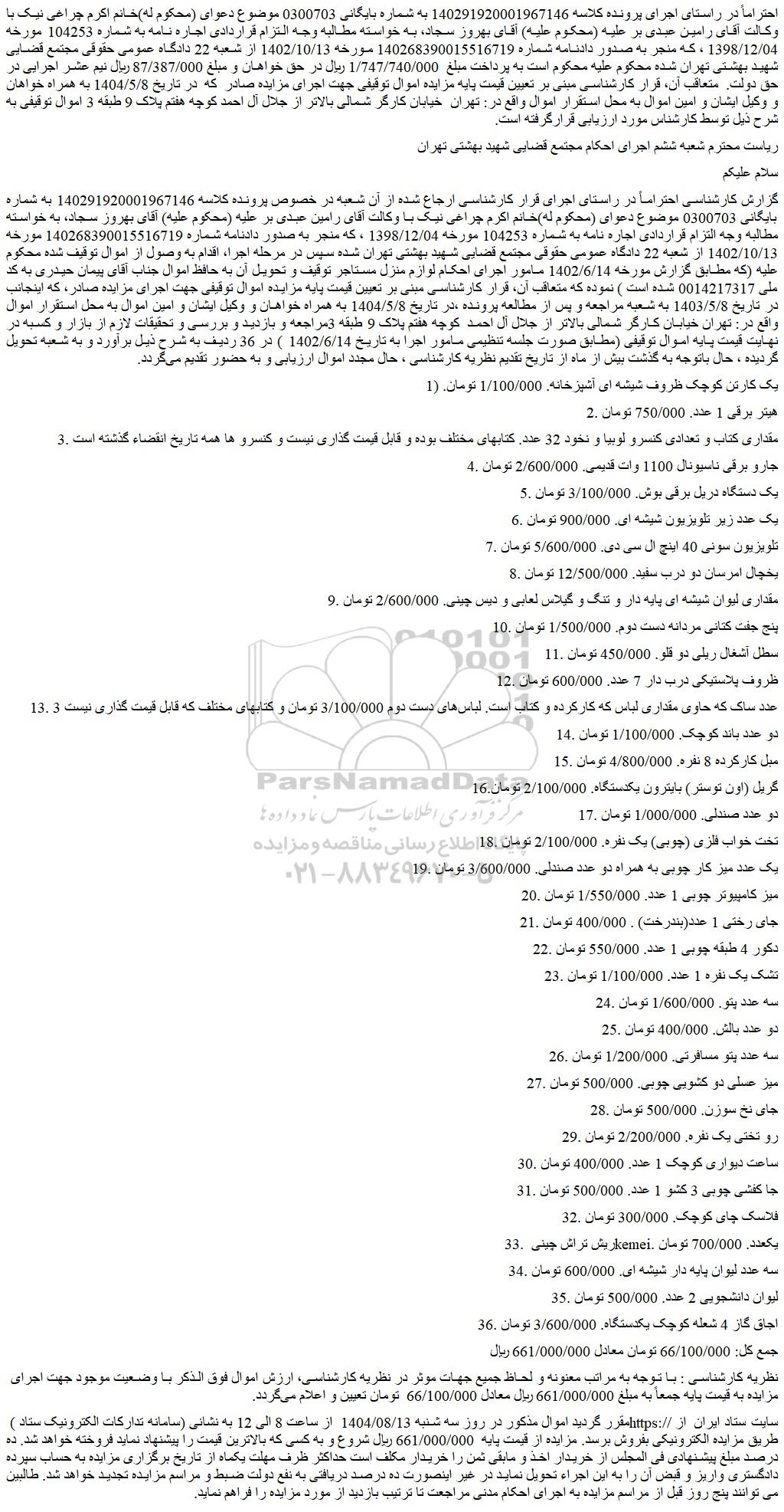 گزارش کارشناسی احتراماً در راستای اجرای قرار کارشناسی ارجاع شده از آن شعبه در خصوص پرونده کلاسه 140291920001967146 به شماره بایگانی 0300703 موضوع دعوای (محکوم له)خانم اکرم چراغی نیک با وکالت آقای رامین عبدی بر علیه (محکوم علیه) آقای بهروز سجاد، به خواسته مطالبه وجه التزام قراردادی اجاره نامه به شماره 104253 مورخه 1398/12/04 ، که منجر به صدور دادنامه شماره 140268390015516719 مورخه 1402/10/13 از شعبه 22 دادگاه عمومی حقوقی مجتمع قضایی شهید بهشتی تهران شده سپس در مرحله اجرا، اقدام به وصول از اموال توقیف شده محکوم علیه (که مطابق گزارش مورخه 1402/6/14 مامور اجرای احکام لوازم منزل مستاجر توقیف و تحویل آن به حافظ اموال جناب آقای پیمان حیدری به کد ملی 0014217317 شده است ) نموده که متعاقب آن، قرار کارشناسی مبنی بر تعیین قیمت پایه مزایده اموال توقیفی جهت اجرای مزایده صادر، که اینجانب در تاریخ 1403/5/8 به شعبه مراجعه و پس از مطالعه پرونده ،در تاریخ 1404/5/8 به همراه خواهان و وکیل ایشان و امین اموال به محل استقرار اموال واقع در: تهران خیابان کارگر شمالی بالاتر از جلال آل احمد کوچه هفتم پلاک 9 طبقه 3مراجعه و بازدید و بررسی و تحقیقات لازم از بازار و کسبه در نهایت قیمت پایه اموال توقیفی (مطابق صورت جلسه تنظیمی مامور اجرا به تاریخ 1402/6/14 ) در 36 ردیف به شرح ذیل برآورد و به شعبه تحویل گردیده ، حال باتوجه به گذشت بیش از ماه از تاریخ تقدیم نظریه کارشناسی ، حال مجدد اموال ارزیابی و به حضور تقدیم می گردد.