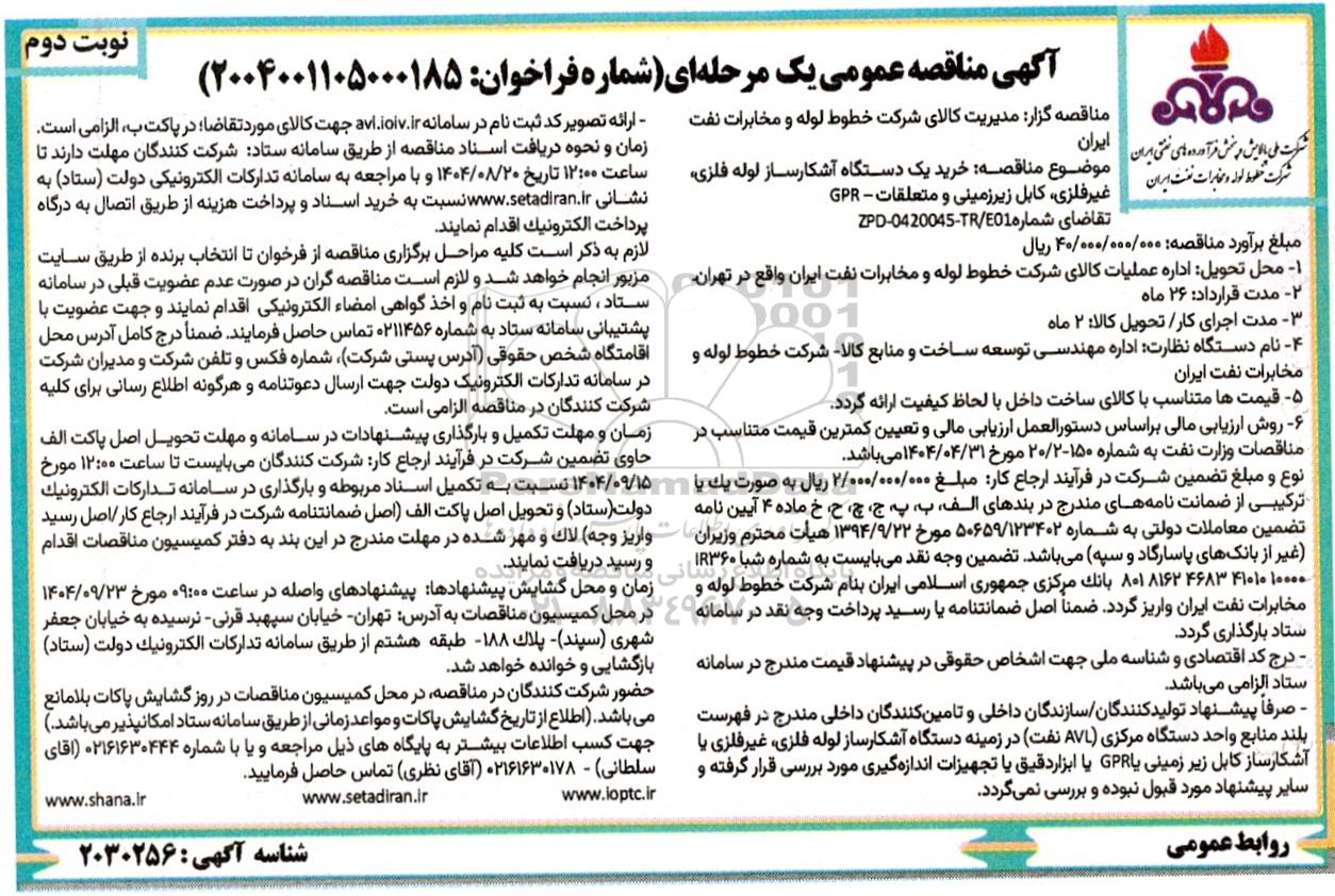 | عنوان آگهی: مناقصه خرید یک دستگاه آشکارساز لوله فلزی، غیر فلزی، کابل زیرزمینی و متعلقات - GPR- نوبت دوم |