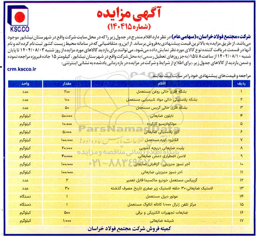 شرکت مجتمع فولاد خراسان (سهامی عام) در نظر دارد اقلام مندرج در جدول زیر را که در محل سایت شرکت واقع در شهرستان نیشابور موجود میباشد، از طریق مزایده به بالاترین قیمت پیشنهادی به فروش برساند . از این رو، متقاضیانی که در سامانه محیط زیست کشور ثبت نام کرده اند و نام آنها در قسمت دریافت کننده نوع کالای مورد نظر نمایش داده میشود میتوانند برای بازدید کالاهای مورد مزایده از روز شنبه 1404.8.3 تا پایان شنبه 1404.8.10 از ساعت 8 تا 15 به جز روزهای تعطیل رسمی به محل شرکت واقع در شهرستان نیشابور، کیلومتر 15 جاده فیروزه مراجعه نموده و ضمن بازدید از کالاهای جدول زیر برای اطلاع از شرایط و شرکت در مزایده در بازه زمانی یاد شده به نشانی اینترنتی crm.kscco.ir مراجعه و قیمت های پیشنهادی خود را در سایت ثبت نمایند.