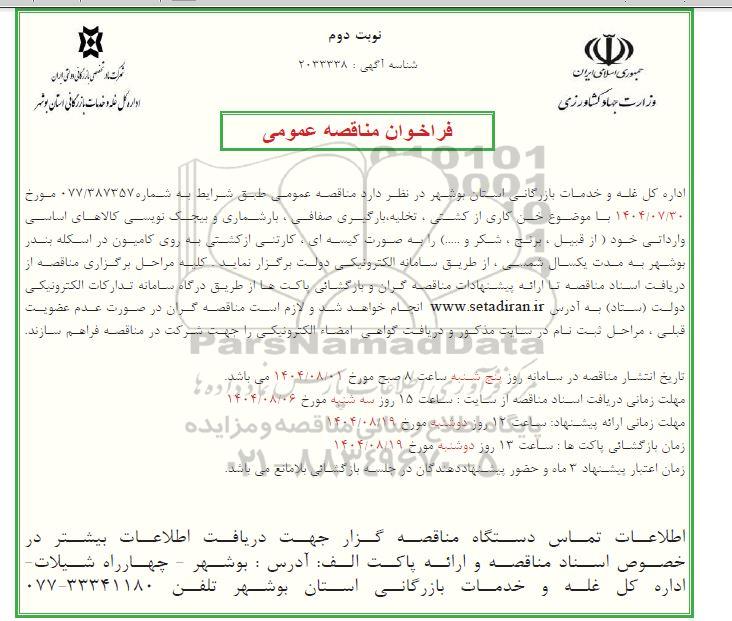 اداره کل غله و خدمات بازرگانی استان بوشهر در نظر دارد مناقصه عمومی طبق شرایط به شماره 077/387357 مورخ 1404.07.30 با موضوع خن کاری از کشتی، تخلیه، بارگیری صفافی، بارشماری و بیجک نویسی کالاهای اساسی وارداتی خود (از قبیل، برنج، شکر و...) را به صورت کیسه ای، کارتنی از کشتی به روی کامیون در اسکله بندر بوشهر به مدت یک سال شمسی، از طریق سامانه الکترونیکی دولت برگزار نماید. کلیه مراحل برگزاری مناقصه از دریافت اسناد مناقصه تا ارائه پیشنهادات مناقصه گران و بازگشایی پاکت ها از طریق درگاه سامانه تدارکات الکترونیکی دولت (ستاد) به آدرس ستاد ایران انجام خواهد شد و لازم است مناقصه گران در صورت عدم عضویت قبلی مراحل ثبت نام در سایت مذکور و دریافت گواهی امضای الکترونیکی را جهت شرکت در مناقصه فراهم سازند.