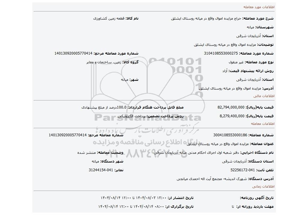 | شرح مورد معامله: حراج مزایده اموال واقع در میانه روستای ایشلق | | نام کالا: قطعه زمین کشاورزی | | شهرستان: میانه | | استان: آذربایجان شرقی | | توضیحات: مزایده اموال واقع در میانه روستای ایشلق | | شماره مورد معامله: 3104108553000275 | | شماره مورد معامله مرجع: 140130920005770414 | | نوع مورد معامله: غیر منقول | | گروه کالا: زمین، ساختمان و معابر | | روش ارائه پیشنهاد قیمت: آزاد