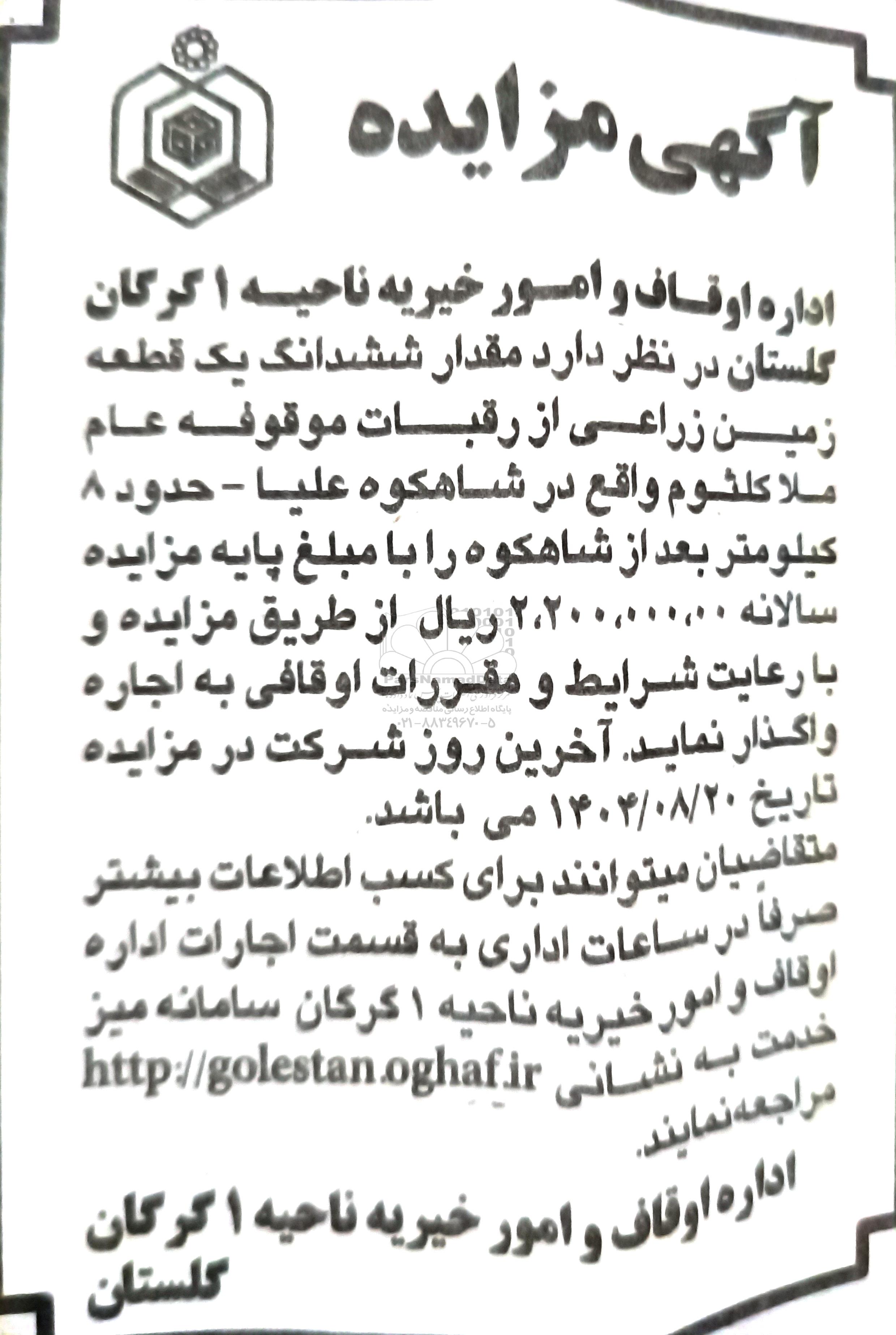 تلفن:5- 88349670 (021) فکس: 88349673 (021) Website: www.ParsNamadData.com E-mail: Info@ParsNamadData.com مزایده واگذاری ششدانگ یک قطعه زمین زراعی