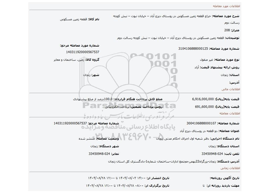 | شرح مورد معامله: حراج قطعه زمین مسکونی در روستای دیزج آباد – خیابان نبوت – نبش کوچه رسالت دوم | | نام کالا: قطعه زمین مسکونی | | متراژ: 208 | | توضیحات: قطعه زمین مسکونی در روستای دیزج آباد – خیابان نبوت – نبش کوچه رسالت دوم | | شماره مورد معامله: 3104106888000125 | | شماره مورد معامله مرجع: 140311920000567537 | | نوع مورد معامله: غیر منقول | | گروه کالا: زمین، ساختمان و معابر | | روش ارائه پیشنهاد قیمت: آزاد