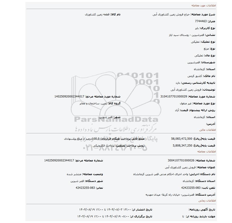 | عنوان آگهی: مزایده فروش زمین کشاورزی آبی |
