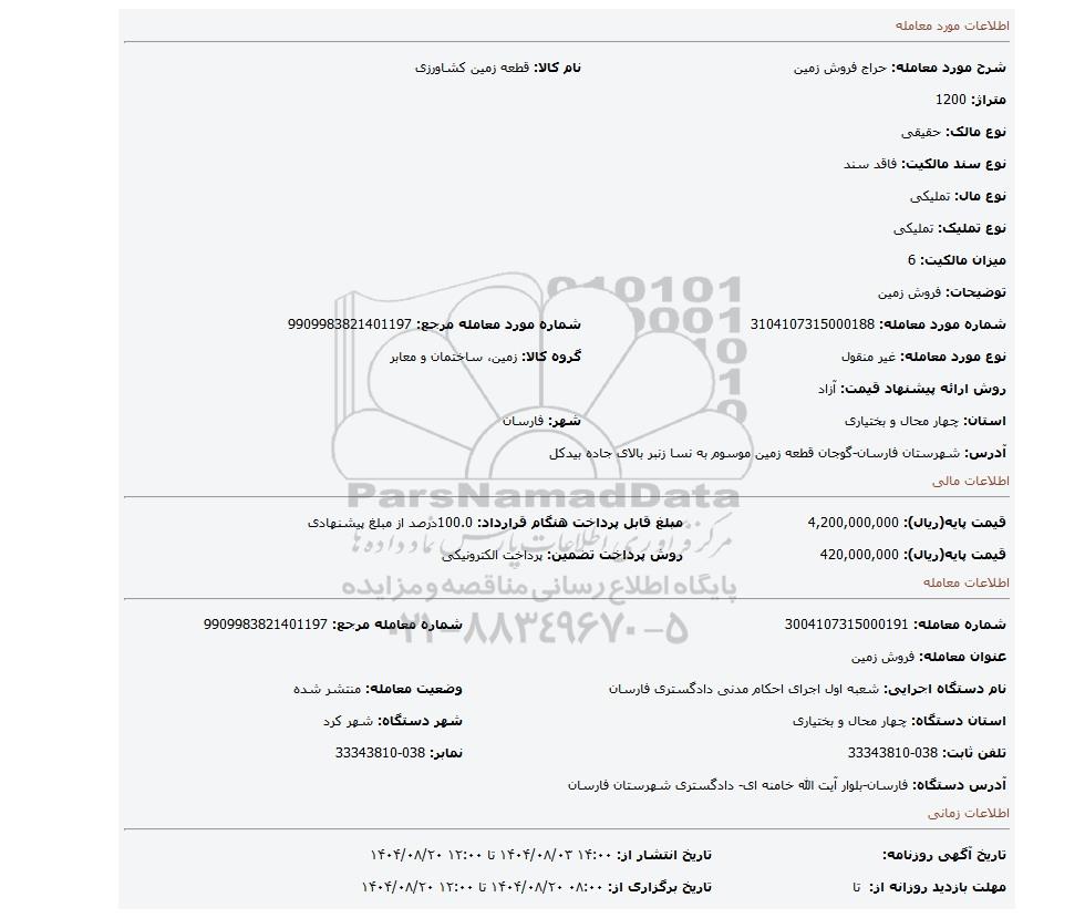 | تاریخ آگهی روزنامه: | | تاریخ انتشار از: ۱۴۰۴/۰۸/۰۳ ۱۴:۰۰ تا ۱۴۰۴/۰۸/۲۰ ۱۲:۰۰ | | مهلت بازدید روزانه از: تا | | تاریخ برگزاری از: ۱۴۰۴/۰۸/۲۰ ۰۸:۰۰ تا ۱۴۰۴/۰۸/۲۰ ۱۲:۰۰ |