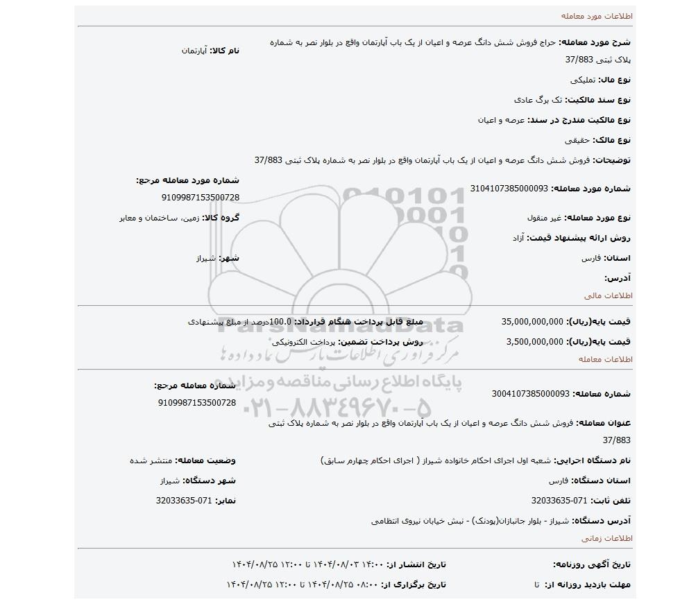 | شماره معامله: 3004107385000093 | | شماره معامله مرجع: 9109987153500728 | | عنوان معامله: فروش شش دانگ عرصه و اعیان از یک باب آپارتمان واقع در بلوار نصر به شماره پلاک ثبتی 37/883 | | نام دستگاه اجرایی: شعبه اول اجرای احکام خانواده شیراز ( اجرای احکام چهارم سابق) | | وضعیت معامله: منتشر شده | | استان دستگاه: فارس | | شهر دستگاه: شیراز | | تلفن ثابت: 071-32033635 | | نمابر: 071-32033635 | | آدرس دستگاه: شیراز - بلوار جانبازان(پودنک) - نبش خیابان نیروی انتظامی |