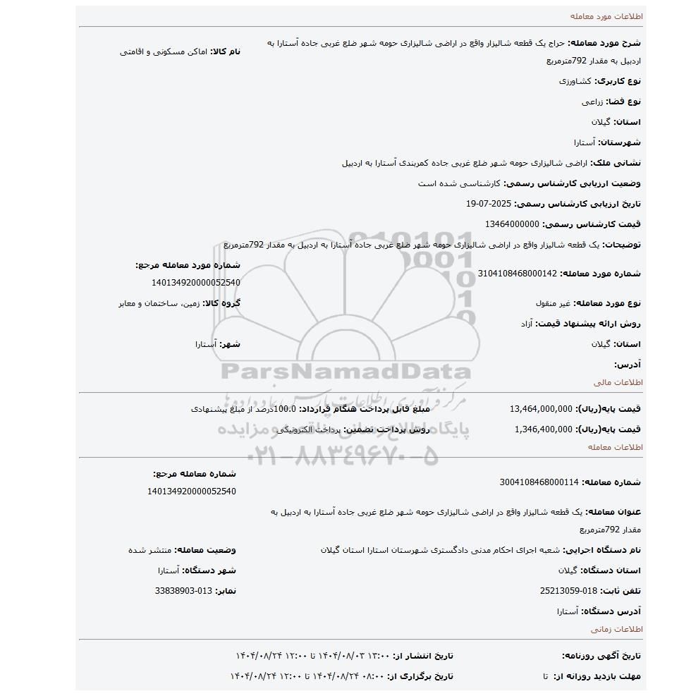 | شرح مورد معامله: حراج یک قطعه شالیزار واقع در اراضی شالیزاری حومه شهر ضلع غربی جاده آستارا به اردبیل به مقدار 792مترمربع | | نام کالا: اماکن مسکونی و اقامتی | | نوع کاربری: کشاورزی | | نوع فضا: زراعی | | استان: گیلان | | شهرستان: آستارا | | نشانی ملک: اراضی شالیزاری حومه شهر ضلع غربی جاده کمربندی آستارا به اردبیل | | وضعیت ارزیابی کارشناس رسمی: کارشناسی شده است | | تاریخ ارزیابی کارشناس رسمی: 2025-07-19 | | قیمت کارشناس رسمی: 13464000000 | | توضیحات: یک قطعه شالیزار واقع در اراضی شالیزاری حومه شهر ضلع غربی جاده آستارا به اردبیل به مقدار 792مترمربع | | شماره مورد معامله: 3104108468000142 | | شماره مورد معامله مرجع: 140134920000052540 | | نوع مورد معامله: غیر منقول | | گروه کالا: زمین، ساختمان و معابر | | روش ارائه پیشنهاد قیمت: آزاد