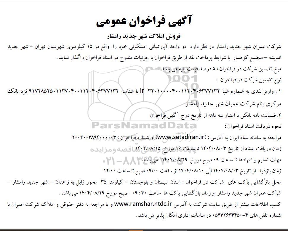 شرکت عمران شهر جدید رامشار در نظر دارد دو واحد آپارتمان مسکونی خود را واقع در 15 کیلومتری شهرستان تهران- شهر جدید اندیشه- مجتمع کوهسار با شرایط پرداخت نقد از طریق فراخوان با جزییات مندرج در اسناد فراخوان واگذار نماید.