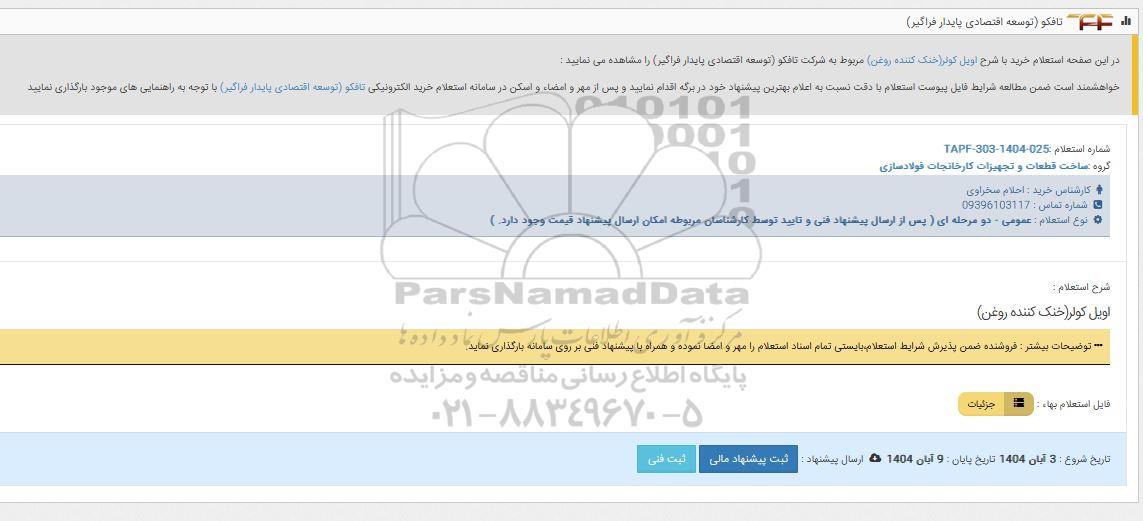 در این صفحه استعلام خرید با شرح اویل کولر خنک کننده روغن مربوط به شرکت تافکو توسعه اقتصادی پایدار فراگیر را مشاهده می نمایید :