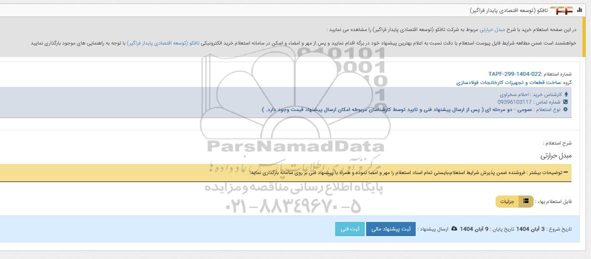 در این صفحه استعلام خرید با شرح مبدل حرارتی مربوط به شرکت تافکو (توسعه اقتصادی پایدار فراگیر) را مشاهده می نمایید :