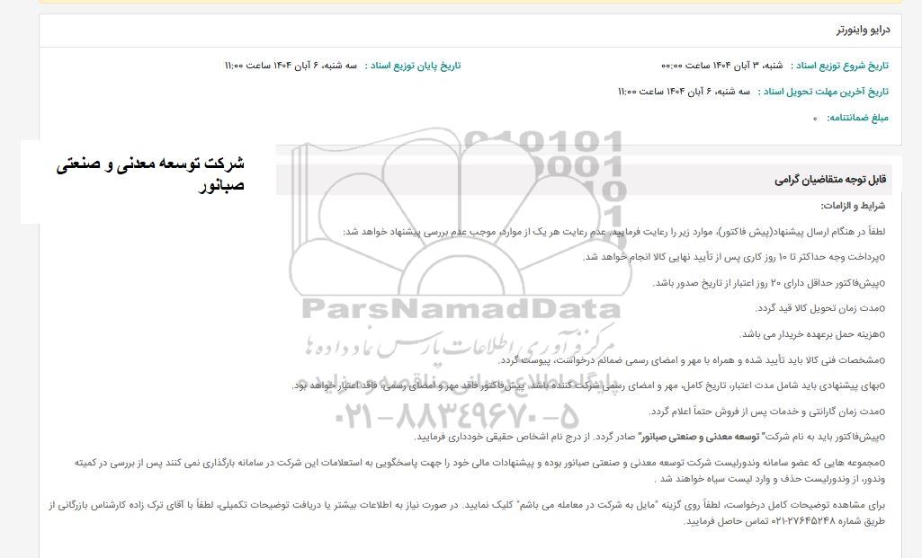 تاریخ آخرین مهلت تحویل اسناد: سه شنبه 6 آبان 1404 ساعت 11:00