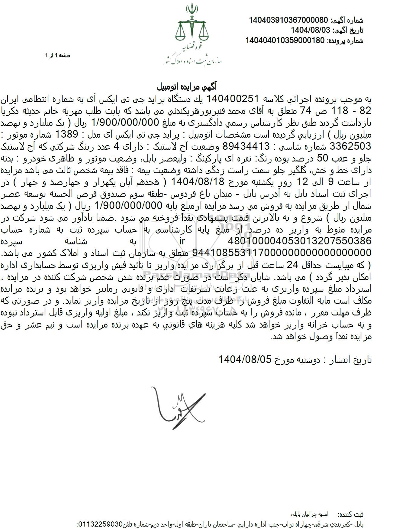 به موجب پرونده اجرائي كلاسه 140400251 يک دستگاه پراید جی تی ایکس آی به شماره انتظامی ایران 82 - 118 ص 74 متعلق به آقای محمد قنبرپور هریکندنی میباشد که بابت طلب مهریه خانم حديثه ذكريا بازداشت گردید. طبق نظر کارشناس رسمی دادگستری به مبلغ 1.900.000.000 ريال ) یک میلیارد و نهصد میلیون ریال ( ارزیابی گردیده است مشخصات اتومبیل : پراید جی تی ایکس آی مدل : 1389 شماره موتور : 3362503 شماره شاسی : 89434413 وضعیت آج لاستیک : دارای 4 عدد رینگ شرکتی که آج لاستیک جلو و عقب 50 درصد بوده رنگ نقره ای پارکینگ : ولیعصر بابل وضعیت موتور و ظاهری خودرو : بدنه دارای خط و خش گلگیر جلو سمت راست زدگی داشته وضعیت بیمه : فاقد بیمه شخص ثالث می باشد مزایده از ساعت 9 الی 12 روز یکشنبه مورخ 1404.08.18 ( هجدهم آبان یکهزار و چهارصد و چهار ) در اجرای ثبت اسناد بابل به آدرس بابل - میدان باغ فردوس طبقه سوم صندوق قرض الحسنه توسعه عصر شمال از طریق مزایده به فروش می رسد مزایده از مبلغ پایه 1.900.000.000 ريال یک میلیارد و نهصد میلیون ریال شروع و به بالاترین قیمت پیشنهادي نقدا فروخته مي شود ضمنا یادآور می شود شرکت در مزایده منوط به واریز ده درصد از مبلغ پایه کارشناسی به حساب سپرده ثبت به شماره حساب IR 480100004053013207550386 شناسه سپرده 944108553117000000000000000000 متعلق به سازمان ثبت اسناد و املاک کشور می باشد. که میبایست حداقل 24 ساعت قبل از برگزاری مزایده واریز تا تائید فیش واریزی توسط حسابداری اداره امکان پذیر گردد) میباشد. شایان ذکر است در صورت عدم برنده شدن شخص شرکت کننده در مزایده ، استرداد مبلغ سپرده واریزی به علت رعایت تشریفات اداری و قانونی زمانبر خواهد بود و برنده مزایده مکلف است ما به التفاوت مبلغ فروش را ظرف مدت پنج روز از تاریخ مزایده واریز نماید و در صورتی که ظرف مهلت مقرر ، مانده فروش را به حساب سپرده ثبت واریز نکند، مبلغ اولیه واریزی قابل استرداد نبوده و به حساب خزانه واریز خواهد شد کلیه هزینه هاي قانوني به عهده برنده مزایده است و نیم عشر و حق مزايده نقداً وصول خواهد شد.