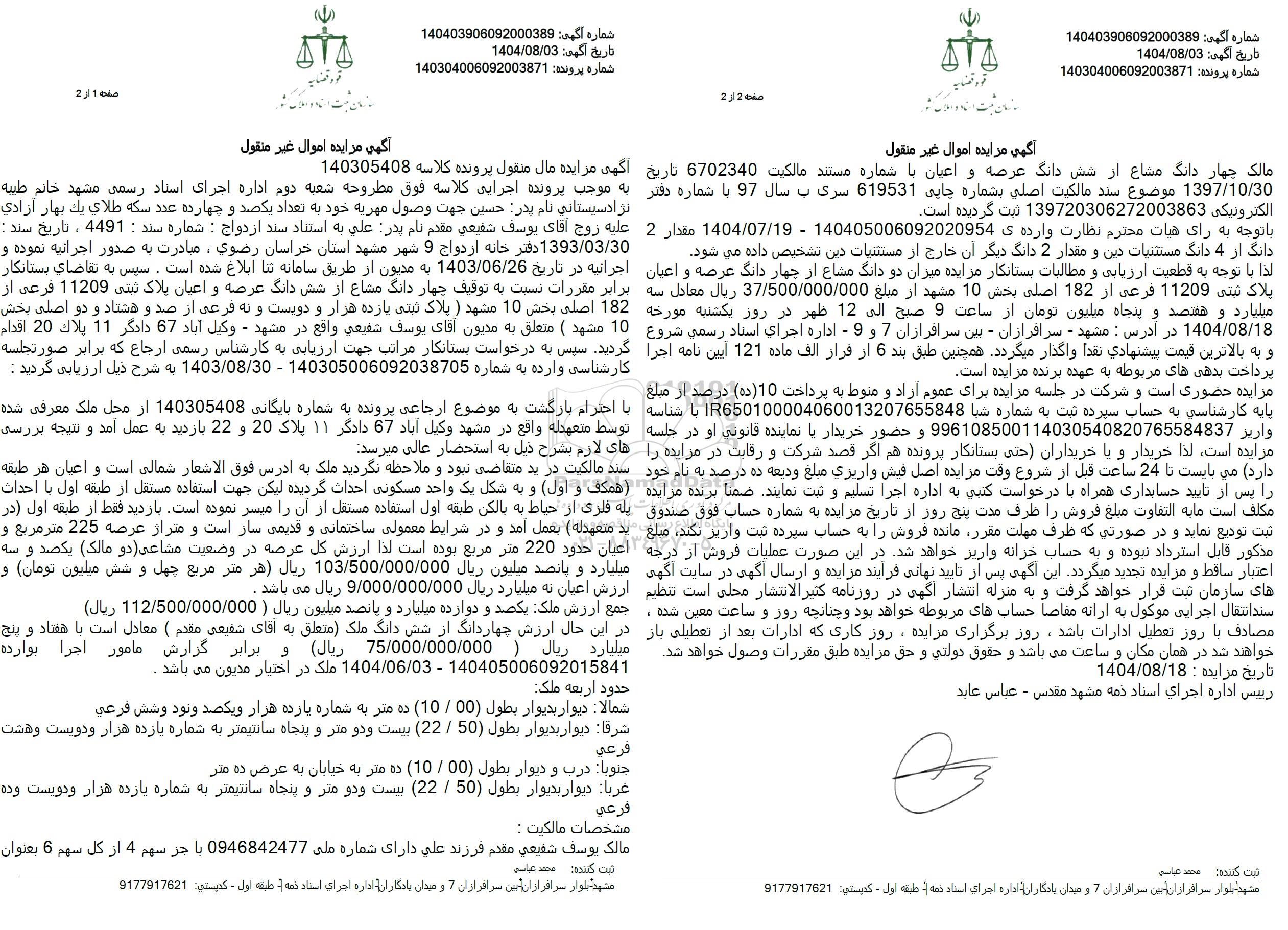 تلفن:5- 88349670 (021) فکس: 88349673 (021) Website: www.ParsNamadData.com E-mail: Info@ParsNamadData.com مزایده فروش دو دانگ یک واحد مسکونی به مساحت 225 مترمربع