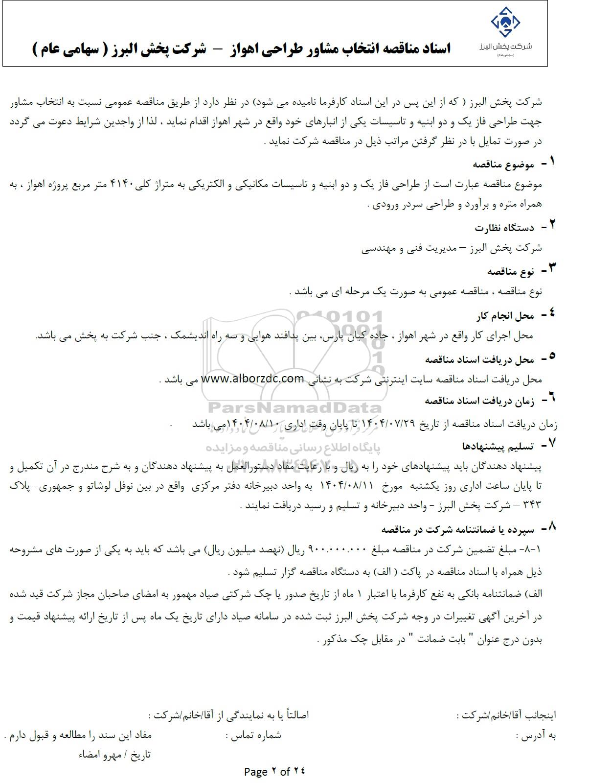 اسناد مناقصه انتخاب مشاور طراحی اهواز - شرکت پخش البرز (سهامی عام)