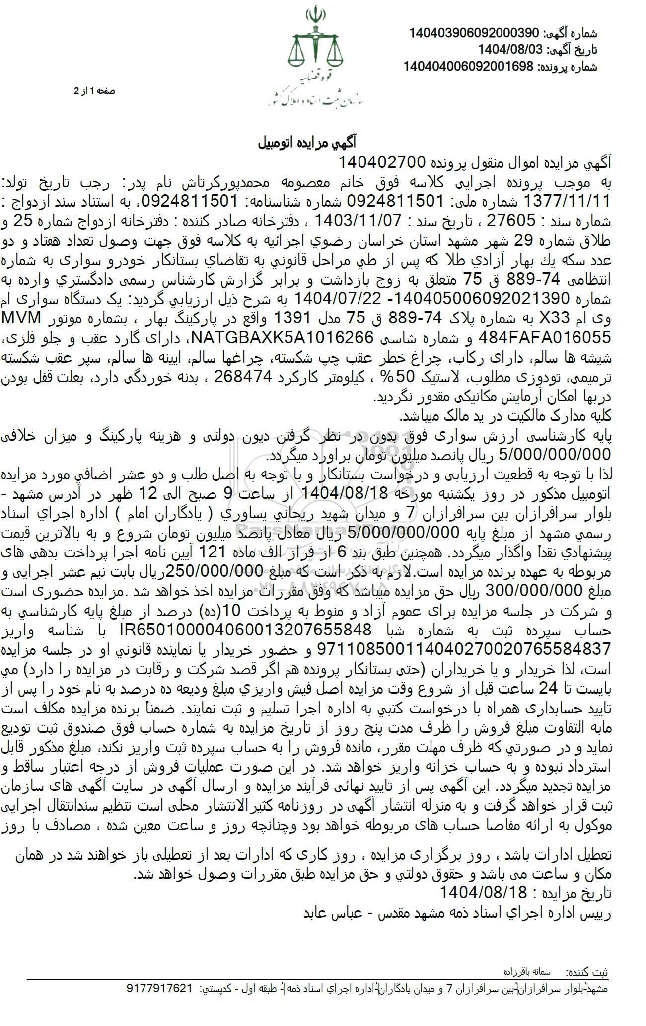 به موجب پرونده اجرایی کلاسه فوق خانم معصومه محمد پور کرتاش نام پدر رجب تاریخ تولد : 1377.11.11 شماره ملی 0924811501 شماره شناسنامه 0924811501 به استناد سند ازدواج شماره سند : 27605 ، تاریخ سند : 1403.11.07 ، دفترخانه صادر کننده : دفترخانه ازدواج شماره 25 و طلاق شماره 29 شهر مشهد استان خراسان رضوی اجرائیه به کلاسه فوق جهت وصول تعداد هفتاد و دو عدد سكه يك بهار آزادی طلا که پس از طی مراحل قانونی به تقاضای بستانکار خودرو سواری به شماره انتظامی 74-889 ق 75 متعلق به زوج بازداشت و برابر گزارش کارشناس رسمی دادگستری وارده به شماره 140405006092021390 - 1404.07.22 به شرح ذیل ارزیابی گردید یک دستگاه سواری ام وی ام X33 به شماره پلاک 74-889 ق 75 مدل 1391 واقع در پارکینگ بهار، بشماره موتور MVM دارای گارد عقب و جلو فلزی NATBAXK5A1016266 484 و شماره شاسیFAFA016055 شیشه ها سالم دارای رکاب چراغ خطر عقب چپ شکسته چراغها سالم ایینه ها سالم، سپر عقب شکسته ترمیمی تو دوزی مطلوب، لاستيك %50% ، کیلومتر کارکرد 268474 ، بدنه خوردگی دارد. بعلت قفل بودن در بها امکان آزمایش مکانیکی مقدور نگردید. کلیه مدارک مالکیت در ید مالک میباشد.