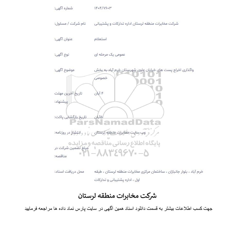 تلفن:5- 88349670 (021) فکس: 88349673 (021) Website: www.ParsNamadData.com E-mail: Info@ParsNamadData.com استعلام واگذاری اخراج پست های خیابان علوی