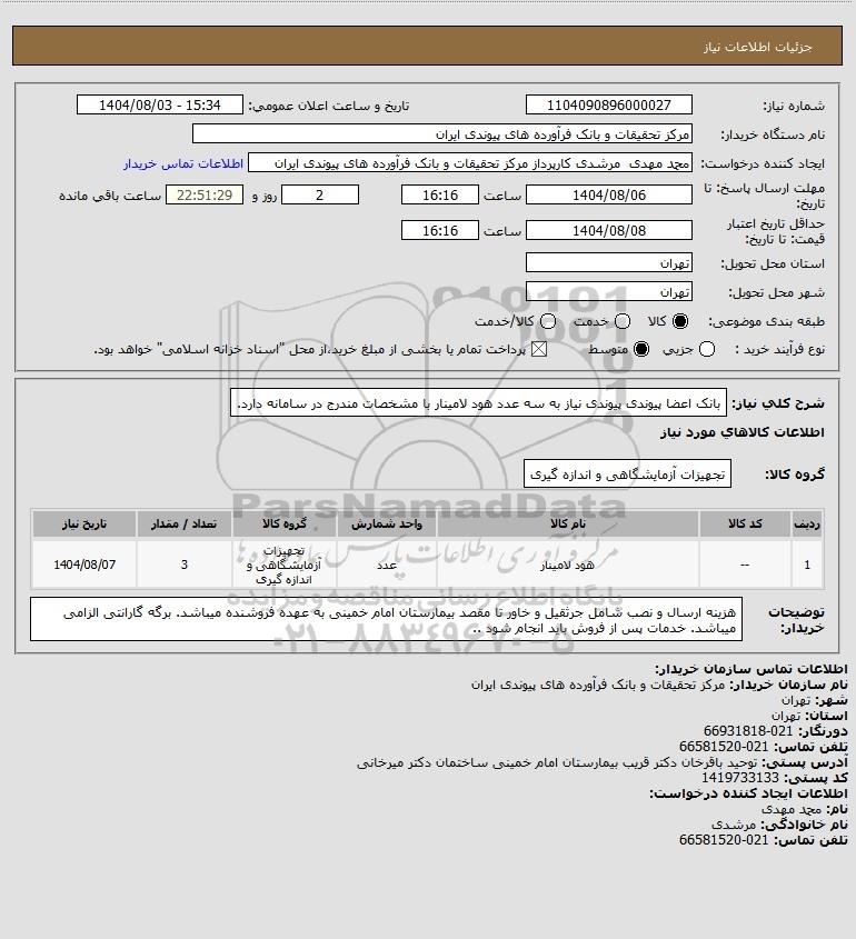 تلفن:5- 88349670 (021) فکس: 88349673 (021) Website: www.ParsNamadData.com E-mail: Info@ParsNamadData.com استعلام بانک اعضا پیوندی پیوندی نیاز به سه عدد هود لامینار با مشخصات مندرج در سامانه دارد.