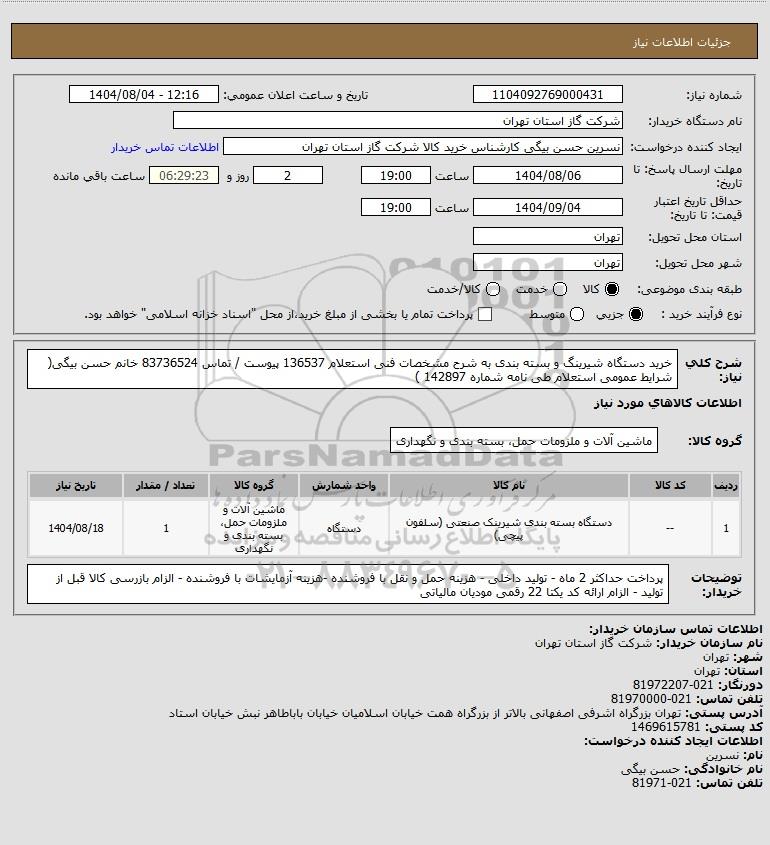 تلفن:5- 88349670 (021) فکس: 88349673 (021) Website: www.ParsNamadData.com E-mail: Info@ParsNamadData.com استعلام خرید دستگاه شیرینگ و بسته بندی به شرح مشخصات فنی استعلام 136537 پیوست / تماس 83736524 خانم حسن بیگی( شرایط عمومی استعلام طی نامه شماره 142897 )