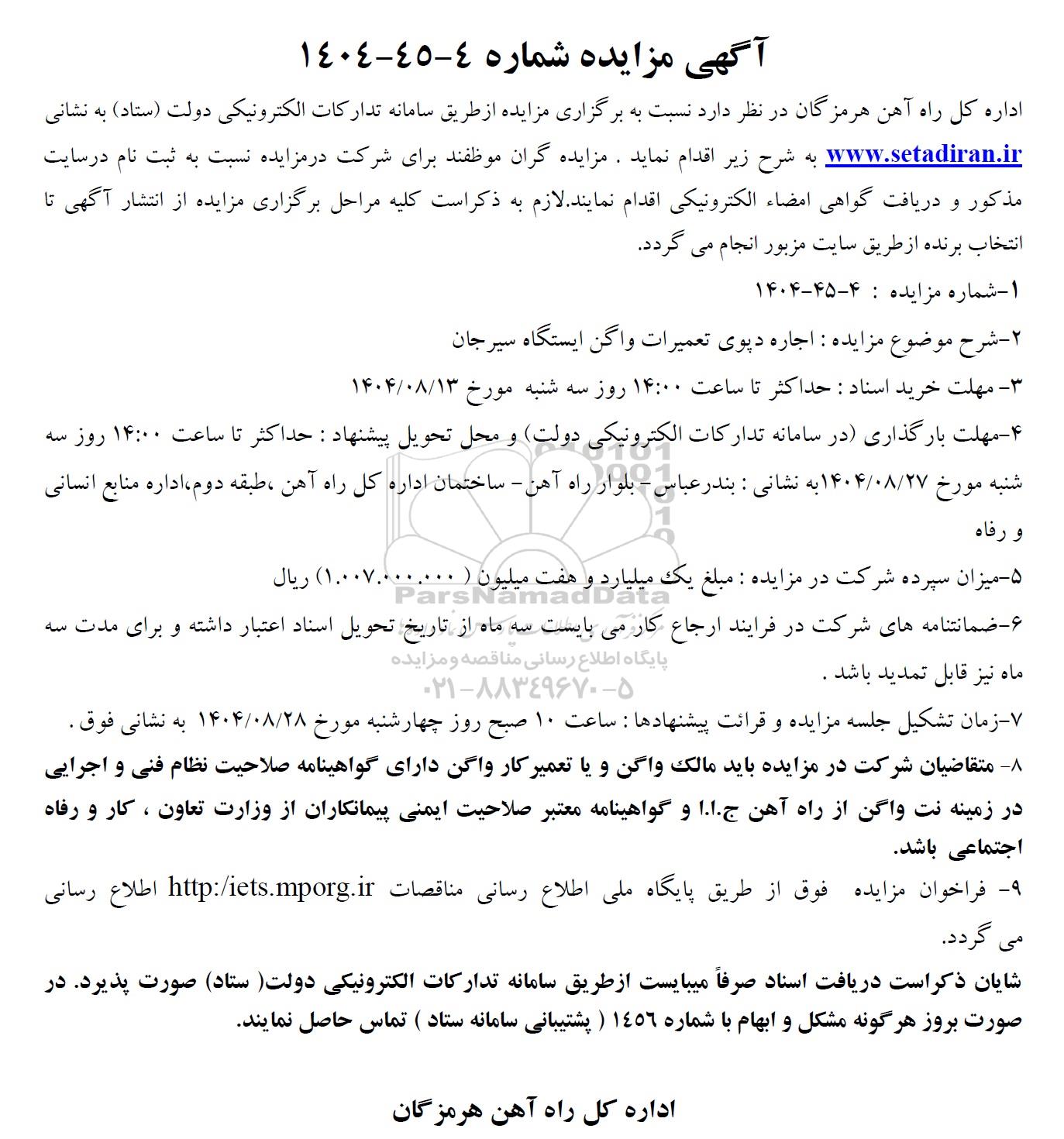 اداره کل راه آهن هرمزگان در نظر دارد نسبت به برگزاری مزایده از طریق سامانه تدارکات الکترونیکی دولت (ستاد) ایران به شرح زیر اقدام نماید. مزایده گران موظفند برای شرکت در مزایده نسبت به ثبت نام در سایت مذکور و دریافت گواهی امضاء الکترونیکی اقدام نمایند. لازم به ذکر است کلیه مراحل برگزاری مزایده از انتشار آگهی تا انتخاب برنده از طریق سایت مزبور انجام می گردد.
