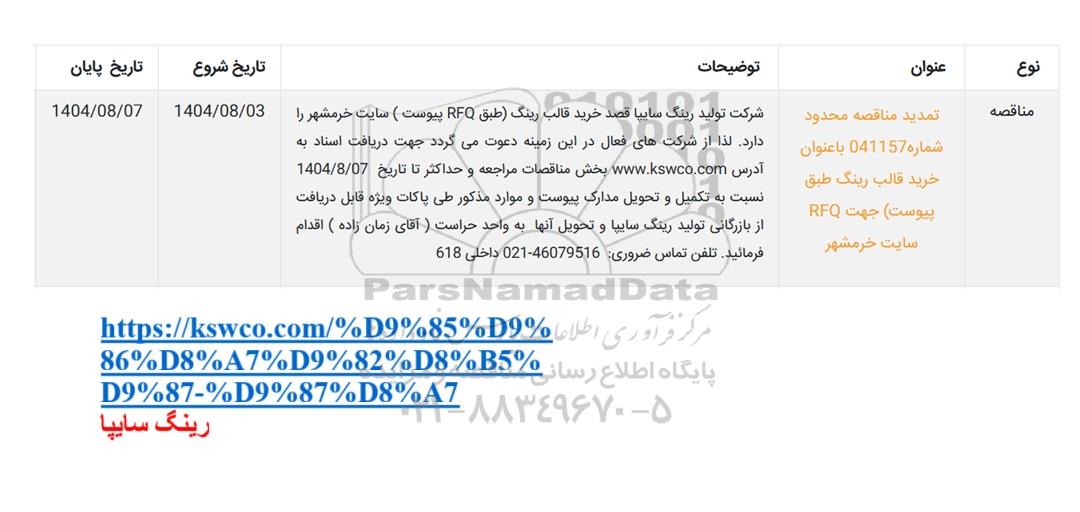 تلفن:5- 88349670 (021) فکس: 88349673 (021) Website: www.ParsNamadData.com E-mail: Info@ParsNamadData.com تمدید مناقصه خرید قالب رینگ طبق پیوست جهت RFQ ..