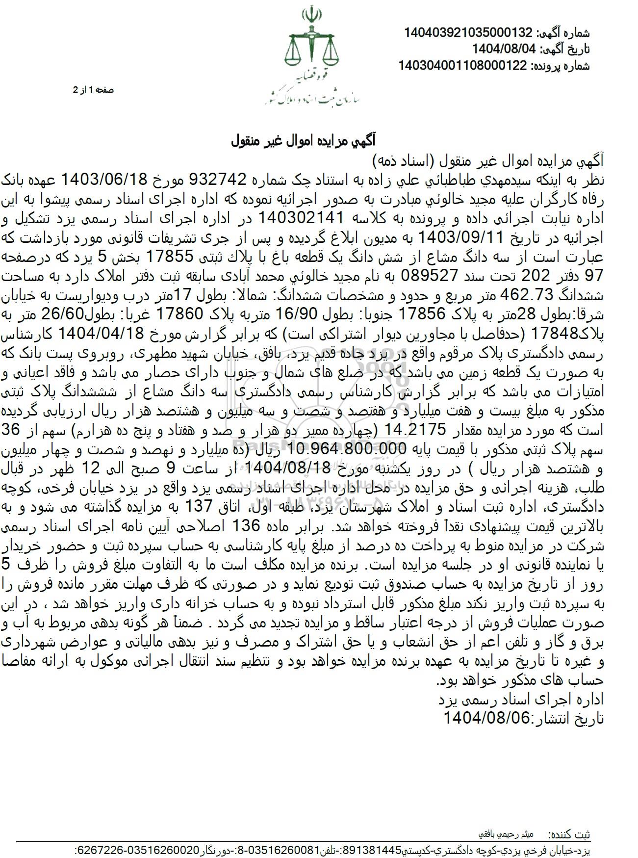 نظر به اینکه سید مهدی طباطبائی علی زاده به استناد چک شماره 932742 مورخ 1403.06.18 عهده بانک رفاه کارگران علیه مجید خالوئی مبادرت به صدور اجرائیه نموده که اداره اجرای اسناد رسمی پیشوا به این اداره نیابت اجرائی داده و پرونده به کلاس کلاسه 140302141 در اداره اجرای اسناد رسمی یزد تشکیل و اجرائیه در تاریخ 1403.09.11 به مدیون ابلاغ گردیده و پس از جری تشریفات قانونی مورد بازداشت که عبارت است از سه دانگ مشاع از شش دانگ یک قطعه باغ با پلاك ثبتی 17855 بخش 5 یزد که در صفحه 97 دفتر 202 تحت سند 089527 به نام مجید خالوئی محمد آبادی سابقه ثبت دفتر املاک دارد به مساحت ششدانگ 462.73 متر مربع و حدود و مشخصات ششدانگ شمالا بطول 17 متر درب و دیواریست به خیابان شرقا : بطول 28 متر به پلاک 17856 جنوبا بطول 16.90 متر به پلاک 17860 غربا بطول 26.60 متر به پلاک 17848 حدفاصل با مجاورین دیوار اشتراکی است که برابر گزارش مورخ 1404.04.18 کارشناس رسمی دادگستری پلاک مرقوم واقع در یزد جاده قدیم یزد بافق خیابان شهید مطهری روبروی پست بانک که به صورت یک قطعه زمین میباشد که در ضلعهای شمال و جنوب دارای حصار میباشد و فاقد اعیانی و امتیازات میباشد که برابر گزارش کارشناس رسمی دادگستری سه دانگ مشاع از شششدانگ پلاک ثبتی مذکور به مبلغ بیست و هفت میلیارد و هفتصد و شصت و سه میلیون و هشتصد هزار ریال ارزیابی گردیده است که مورد مزایده مقدار 14.2175 چهارده ممیز دو هزار و صد و هفتاد و پنج ده هزارم سهم از 36 سهم پلاک ثبتی مذکور با قیمت پایه 10.964.800.000 ریال ده میلیارد و نهصد و شصت و چهار میلیون و هشتصد هزار ریال ( در روز یکشنبه مورخ 1404.08.18 از ساعت 9 صبح الی 12 ظهر در قبال طلب، هزینه اجرائی و حق مزایده در محل اداره اجرای اسناد رسمی یزد واقع در یزد خیابان فرخی کوچه دادگستری اداره ثبت اسناد و املاک شهرستان یزد طبقه اول اتاق 137 به مزایده گذاشته می شود و به بالاترین قیمت پیشنهادی نقدا فروخته خواهد شد. برابر ماده 136 اصلاحی آیین نامه اجرای اسناد رسمی شرکت در مزایده منوط به پرداخت ده درصد از مبلغ پایه کارشناسی به حساب سپرده ثبت و حضور خریدار یا نماینده قانونی او در جلسه مزایده است. برنده مزایده مکلف است ما به التفاوت مبلغ فروش را ظرف 5 روز از تاریخ مزایده به حساب صندوق ثبت تودیع نماید و در صورتی که ظرف مهلت مقرر مانده فروش را به سپرده ثبت واریز نکند مبلغ مذکور قابل استرداد نبوده و به حساب خزانه داری واریز خواهد شد ، در این صورت عملیات فروش از درجه اعتبار ساقط و مزایده تجدید میگردد. ضمنا هر گونه بدهی مربوط به آب و برق و گاز و تلفن اعم از حق انشعاب و یا حق اشتراک و مصرف و نیز بدهی مالیاتی و عوارض شهرداری و غیره تا تاریخ مزایده به عهده برنده مزایده خواهد بود و تنظیم سند انتقال اجرائی موکول به ارائه مقاصا حساب های مذکور خواهد بود.
