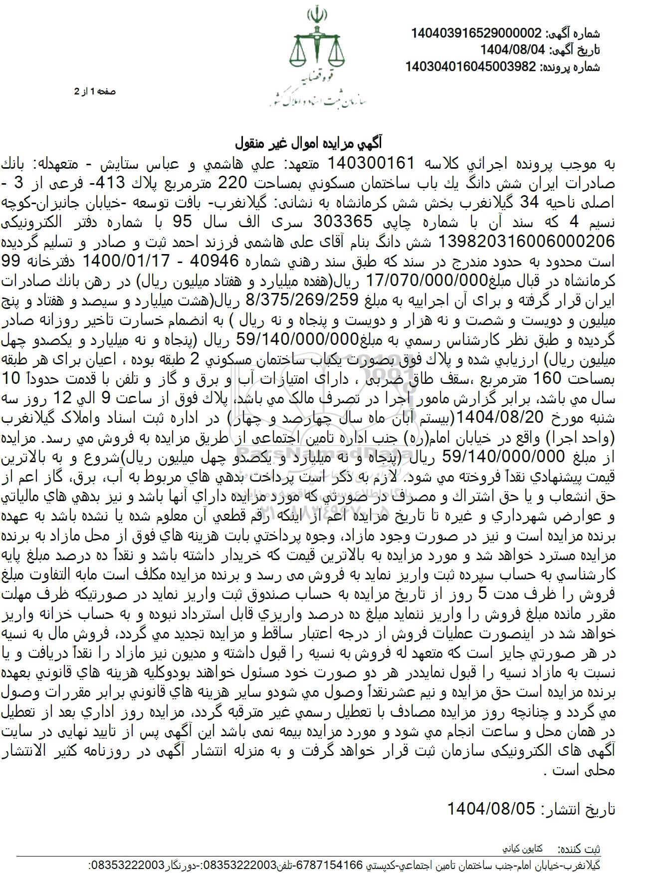 به موجب پرونده اجرائی کلاسه 140300161 متعهد علی هاشمی و عباس ستایش - متعهدله بانک صادرات ایران شش دانگ یک باب ساختمان مسکونی بمساحت 220 متر مربع پلاک 413 فرعی از 3 -اصلی ناحیه 34 گیلانغرب بخش شش کرمانشاه به نشانی گیلانغرب بافت توسعه - خیابان جانبزان- کوچه نسیم 4 که سند آن با شماره چاپی 303365 سری الف سال 95 با شماره دفتر الکترونیکی 139820316006000206 شش دانگ بنام آقای علی هاشمی فرزند احمد ثبت و صادر و تسلیم گردیده است محدود به حدود مندرج در سند که طبق سند رهنی شماره 40946 - 1400.01.17 دفترخانه 99 کرمانشاه در قبال مبلغ 17.070.000.000 ریال هفده میلیارد و هفتاد میلیون ریال در رهن بانک صادرات ایران قرار گرفته و برای آن اجراییه به مبلغ 8.375.269.259 ریال هشت میلیارد و سیصد و هفتاد و پنج میلیون و دویست و شصت و نه هزار و دویست و پنجاه و نه ریال ) به انضمام خسارت تاخیر روزانه صادر گردیده و طبق نظر کارشناس رسمی به مبلغ 59.140.000.000 ریال پنجاه) و نه میلیارد و یکصد و چهل میلیون ریال ارزیابی شده و پلاک فوق بصورت یکباب ساختمان مسکونی 2 طبقه بوده ، اعیان برای هر طبقه بمساحت 160 متر مربع ، سقف طاق ضربی ، دارای امتیازات آب و برق و گاز و تلفن با قدمت حدوداً 10 سال می باشد برابر گزارش مامور اجرا در تصرف مالک می باشد پلاک فوق از ساعت 9 الی 12 روز سه شنبه مورخ 1404.08.20 بیستم آبان ماه سال چهارصد و چهار در اداره ثبت اسناد و املاک گیلانغرب واحد اجرا واقع در خیابان امام (ره) جنب اداره تامین اجتماعی از طریق مزایده به فروش می رسد. مزایده از مبلغ 59.140.000.000 ریال پنجاه و نه میلیارد و یکصد و چهل میلیون (ریال) شروع و به بالاترین قیمت پیشنهادی نقداً فروخته می شود. لازم به ذکر است پرداخت بدهی های مربوط به آب برق گاز اعم از حق انشعاب و یا حق اشتراک و مصرف در صورتی که مورد مزایده دارای آنها باشد. و نیز بدهی های مالیاتی و عوارض شهرداری و غیره تا تاریخ مزایده اعم از اینکه رقم قطعی آن معلوم شده یا نشده باشد به عهده برنده مزایده است و نیز در صورت وجود مازاد وجوه پرداختی بابت هزینه های فوق از محل مازاد به برنده مزایده مسترد خواهد شد و مورد مزایده به بالاترین قیمت که خریدار داشته باشد و نقدا ده درصد مبلغ پایه کارشناسی به حساب سپرده ثبت واریز نماید به فروش میرسد و برنده مزایده مکلف است ما به التفاوت مبلغ فروش را ظرف مدت 5 روز از تاریخ مزایده به حساب صندوق ثبت واریز نماید در صورتیکه ظرف مهلت مقرر مانده مبلغ فروش را واریز ننماید مبلغ ده درصد واریزی قابل استرداد نبوده و به حساب خزانه واریز خواهد شد در اینصورت عملیات فروش از درجه اعتبار ساقط و مزایده تجدید میگردد فروش مال به نسیه در هر صورتی جایز است که متعهد له فروش به نسیه را قبول داشته و مدیون نیز مازاد را نقدا دریافت و یا نسبت به مازاد نسیه را قبول نماید در هر دو صورت خود مسئول خواهند بود و کلیه هزینه های قانونی بعهده برنده مزایده است حق مزایده و نیم عشر نقداً وصول می شود و سایر هزینه های قانونی برابر مقررات وصول می گردد و چنانچه روز مزایده مصادف با تعطیل رسمی غیر مترقبه ،گردد مزایده روز اداری بعد از تعطیل در همان محل و ساعت انجام میشود و مورد مزایده بیمه نمی باشد این آگهی پس از تایید نهایی در سایت آگهیهای الکترونیکی سازمان ثبت قرار خواهد گرفت و به منزله انتشار آگهی در روزنامه کثیر الانتشار محلی است.