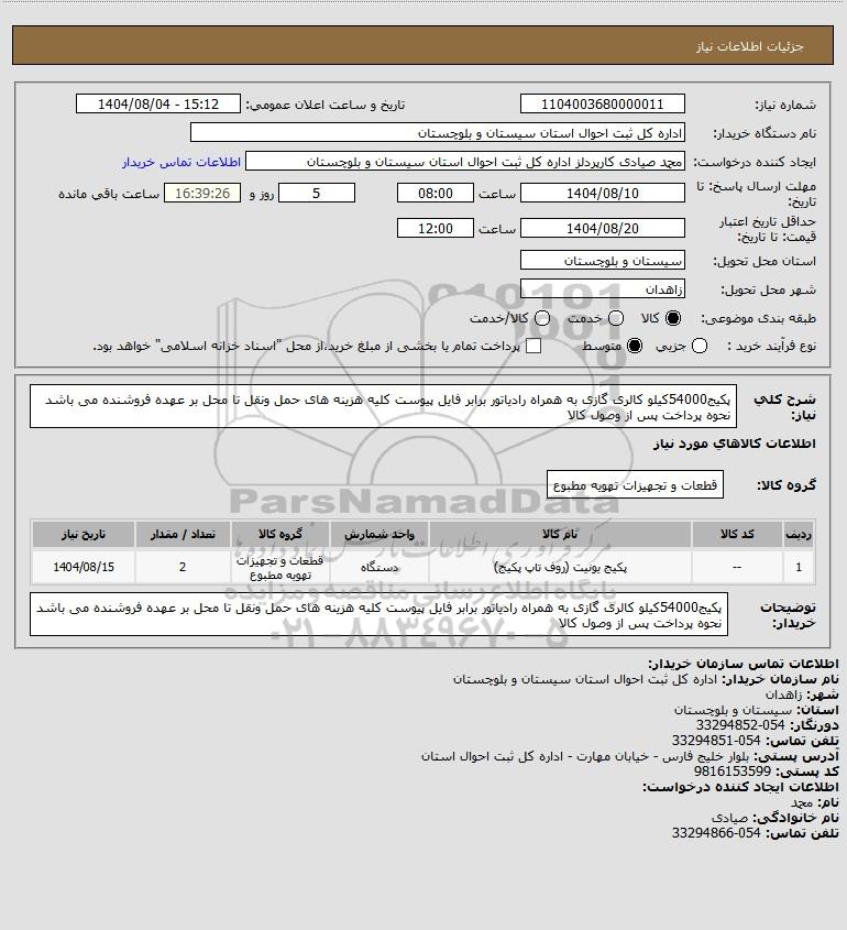 تلفن:5- 88349670 (021) فکس: 88349673 (021) Website: www.ParsNamadData.com E-mail: Info@ParsNamadData.com استعلام پکیج54000کیلو کالری گازی به همراه رادیاتور برابر فایل پیوست کلیه هزینه های حمل ونقل تا محل بر عهده فروشنده می باشد نحوه پرداخت پس از وصول کالا