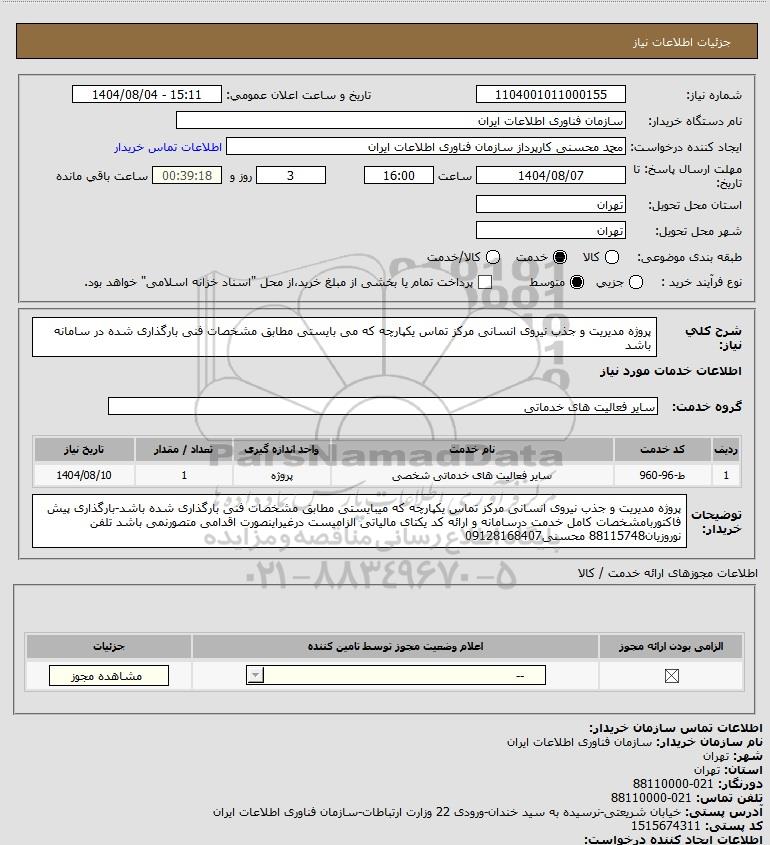 تلفن:5- 88349670 (021) فکس: 88349673 (021) Website: www.ParsNamadData.com E-mail: Info@ParsNamadData.com استعلام پروژه مدیریت و جذب نیروی انسانی مرکز تماس یکپارچه که می بایستی مطابق مشخصات فنی بارگذاری شده در سامانه باشد