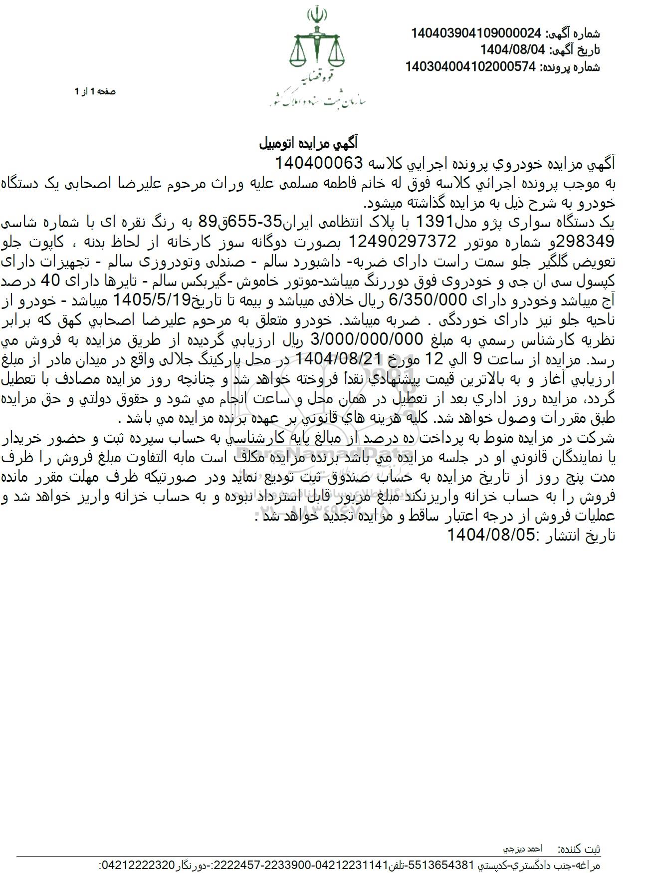 آگهی مزایده خودروی پرونده اجرایی کلاسه 140400063