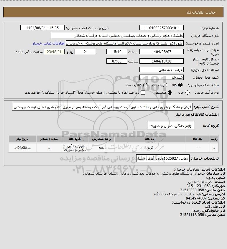 تلفن:5- 88349670 (021) فکس: 88349673 (021) Website: www.ParsNamadData.com E-mail: Info@ParsNamadData.com استعلام فرش و تشک و پتو روتختی و بالشت طبق لیست پیوستی /پرداخت دوماهه پس از تحویل کالا/ شروط طبق لیست پیوستی